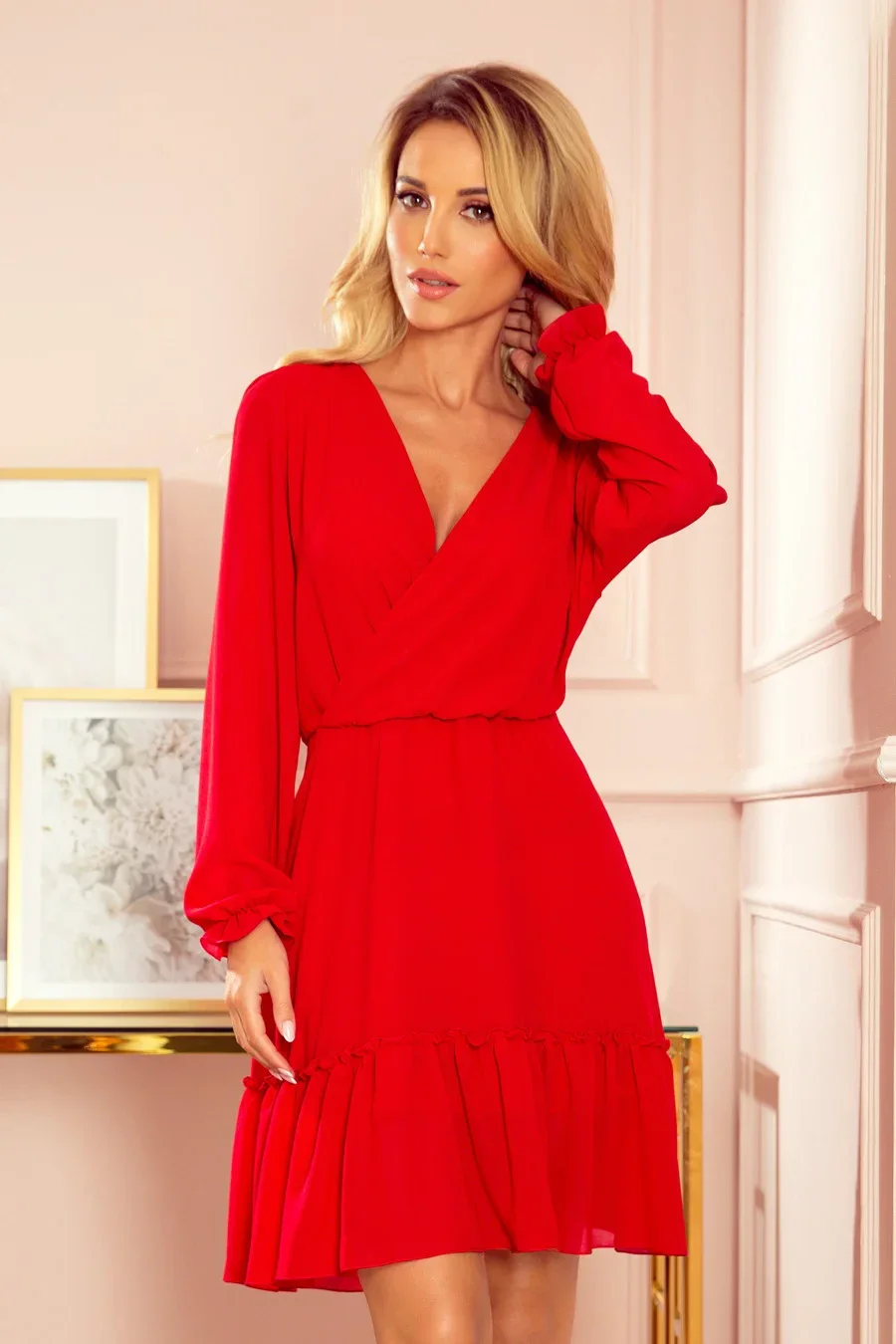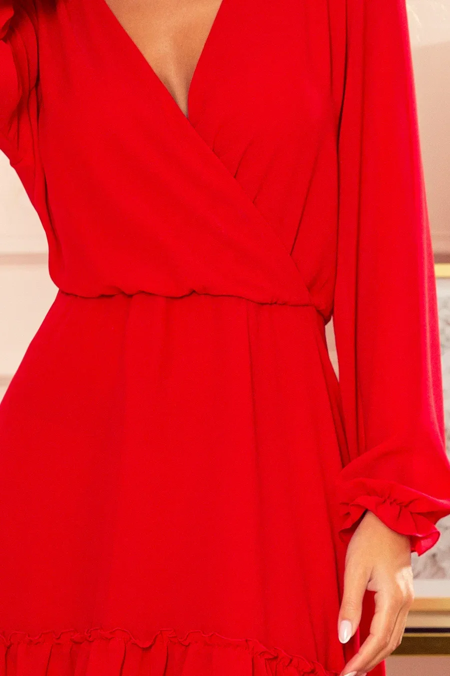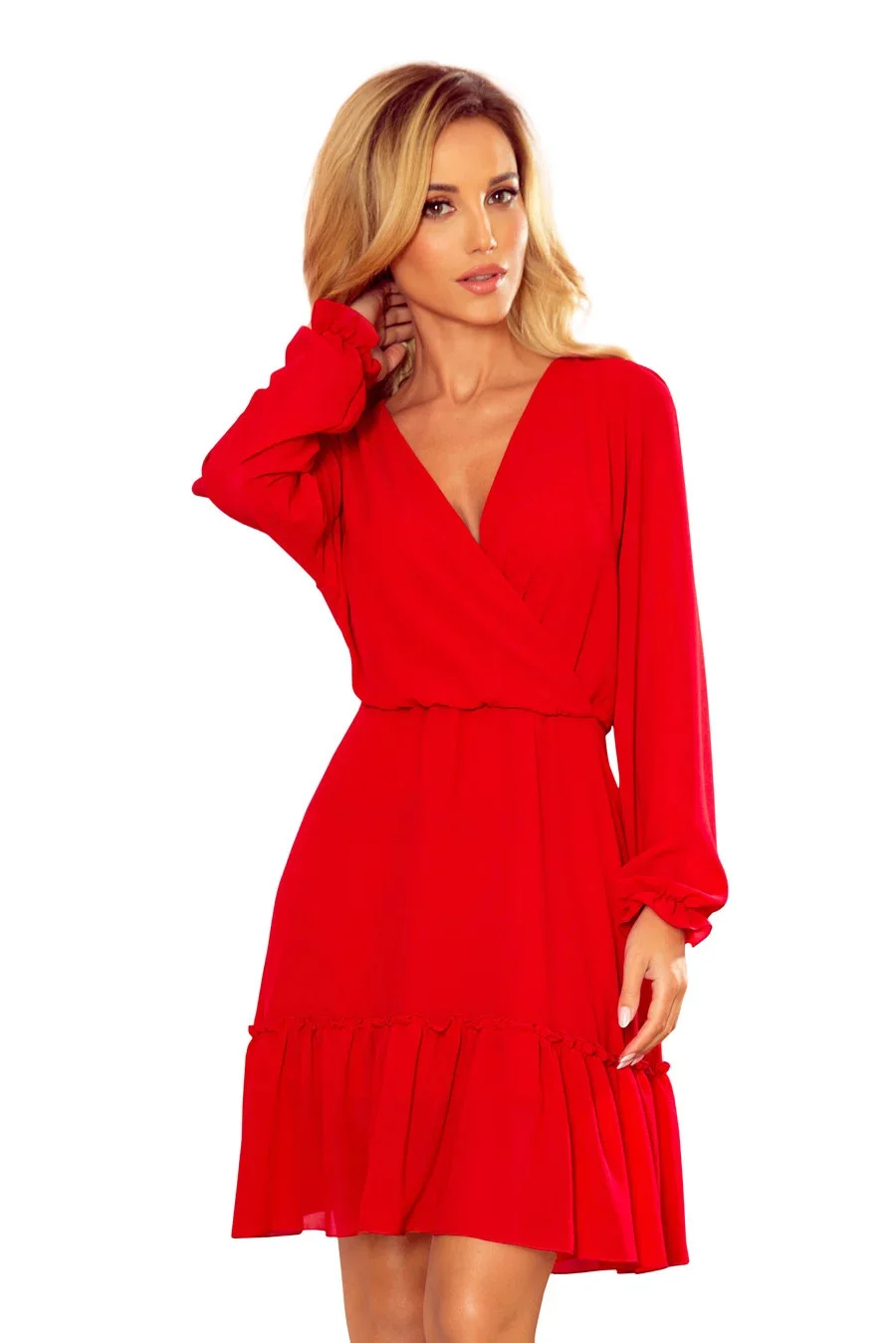 Dámské šaty 329-2 NUMOCO - červená barva - zavinovací volný výstřih do V - vypasované pohodlnou gumou - délka sukně ke kolenům zdobená vkusným volánem - dlouhé rukávy