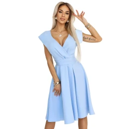 Dámské šaty 348-12 SCARLETT NUMOCO - světle modrá barva - překřížený a nařasený dekolt - krátké rukávy - v pase zavazování na pásek - rozšířená a nařasená sukně