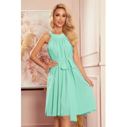 Dámské šaty 350-5 ALIZEE NUMOCO - světle zelená barva - z šifónového materiálu - s vázáním kolem krku a na zádech - bez rukávů - zavazování kolem pasu - délka nad kolena - dole rozšířená