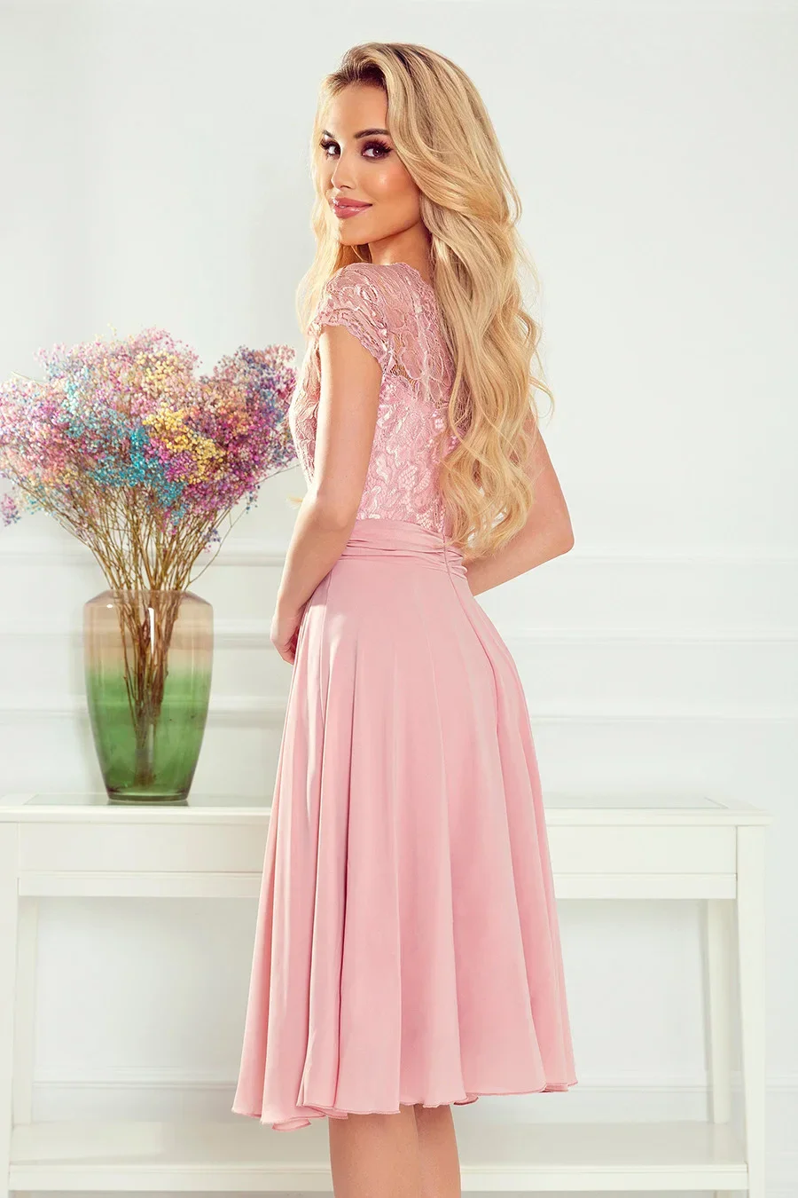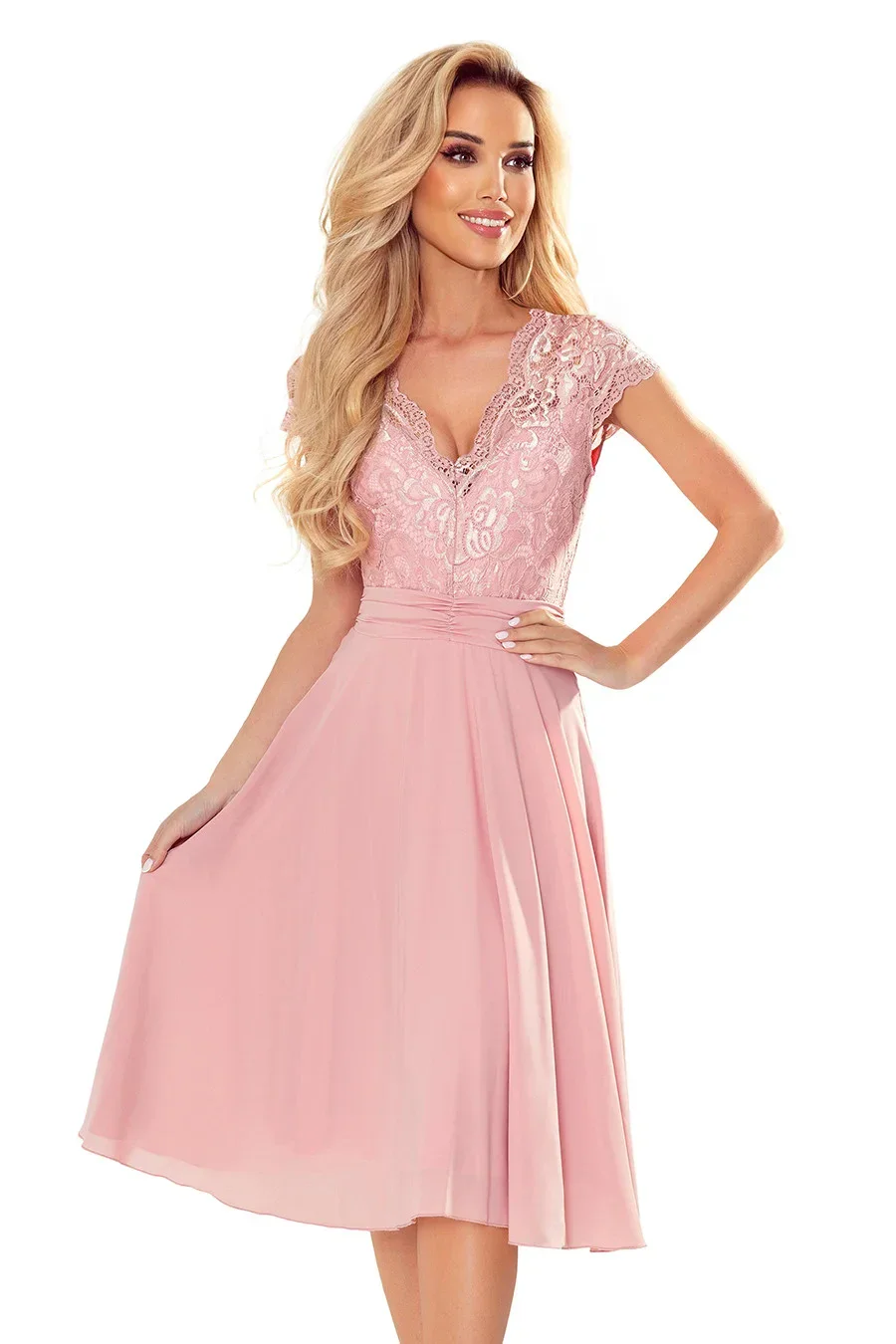 Dámské šaty 381-1 LINDA NUMOCO - starorůžová barva - šifónové šaty - krajkový dekolt - krátké rukávy - nabíraná sukně
