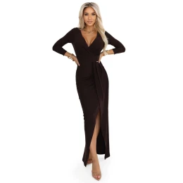 Dámské šaty 404-14 NUMOCO - čokoládová barva - z elastického třpytivého materiálu - pod dekoltem překřížené - tříčtvrteční rukávy - řasení a rozparek ve spodní části
