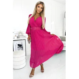 Dámské šaty 414-4 KLARA Numoco basic - fuchsiová barva - řasené šaty z šifónu - překřížený dekolt - dlouhé rukávy