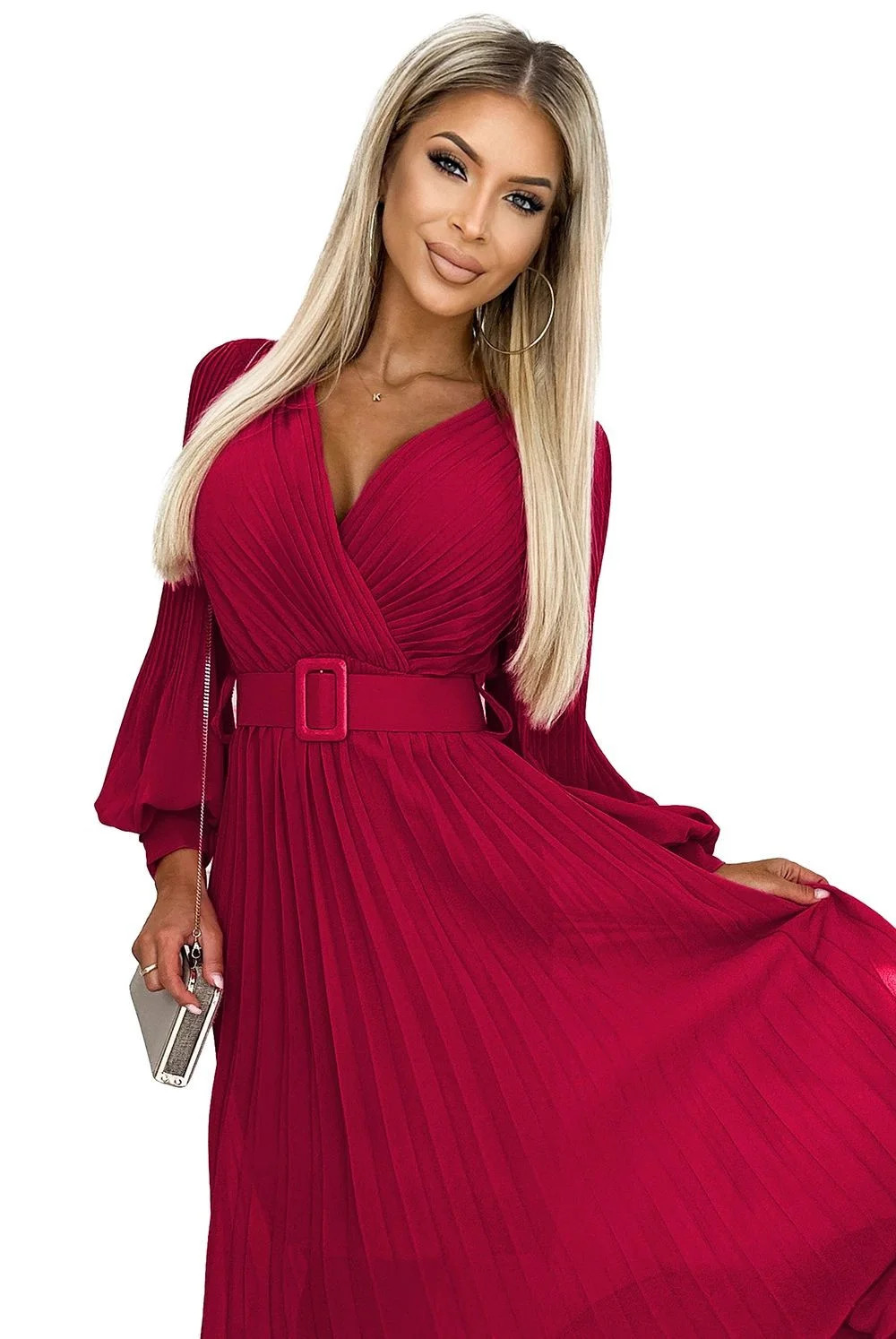 Dámské šaty 414-9 KLARA Numoco basic - bordó barva - řasené šaty z šifónu - překřížený dekolt - dlouhé rukávy