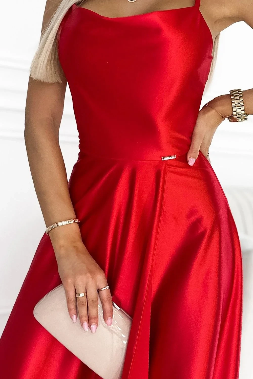 Dámské dlouhé šaty 419-1 Numoco - elegantní šaty ze saténu - tenká ramínka - vázané na zádech - dlouhý rozparek