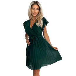 Dámské šaty 424-6 Numoco basic - zelená barva - řasené šaty z šifónu - překřížený dekolt - krátké rukávy s volány - zavazování v pase