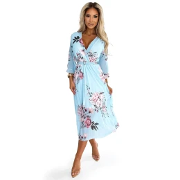 Dámské šaty 448-3 YUNA Numoco basic - světle modrá barva - s potiskem růží - řasené šaty z šifónu - překřížený dekolt - tříčtvrteční rukávy - zavazování v pase