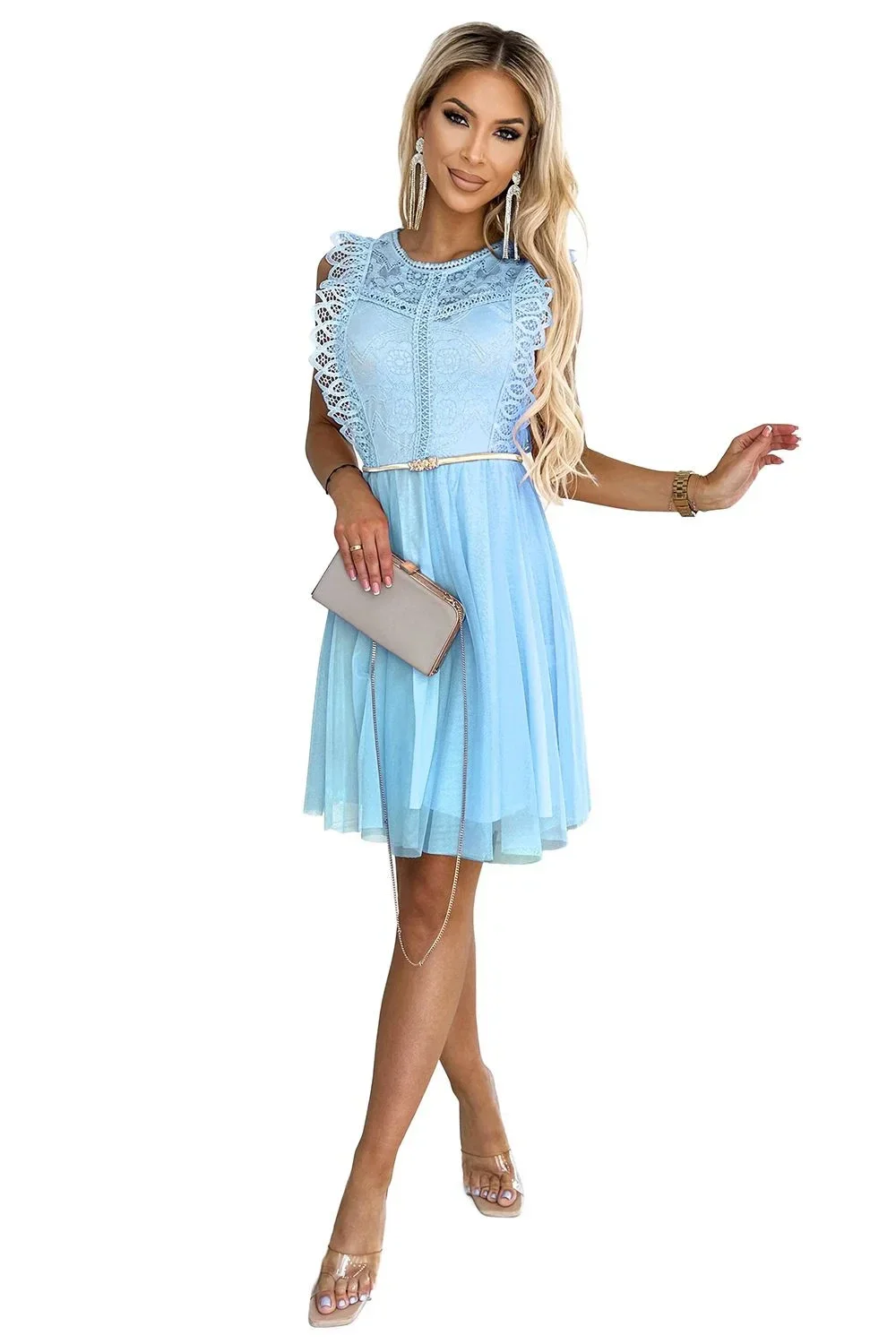 Dámské šaty 454-4 GRETA Numoco basic - modrá barva - elegantní šaty - horní část zdobená krajkou - bez rukávů - zavazování na zlatý pásek - šifónová sukně
