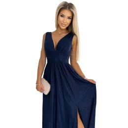 Dámské šaty 490-1 SUSAN NUMOCO - tmavě modrá barva - otevřený výstřih - prošívání v pase - rozparek - elastický materiál se třpytkami - ideální na svatby, plesy