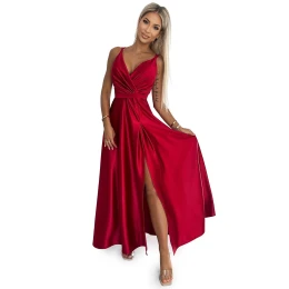 Dámské šaty 498-4 NUMOCO - červená barva - zavinovací výstřih - otevřený dekolt - dvojitá ramínka - zapínání vzadu na skrytý zip