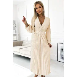 Dámské šaty 504-7 VIVIANA Numoco basic - béžová barva - z mačkavého materiálu - plisované midi šaty - dlouhé rukávy - psaníčkový výstřih - široký pásekMateriálové složení: 100% polyester
