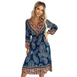 Dámské šaty 510-1 Numoco basic - modrá barva - se vzorem - plisované midi šaty - dlouhé rukávy - výstřih a lemování v hnědé vzorované látce - vázání v pase na černý pásek