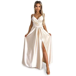 Dámské šaty 512-3 JULIET NUMOCO - béžová barva - z lesklého, hladkého a lehce elastického saténu - elegantní maxi dlouhé šaty - na ramínka - překřížený výstřih - dlouhý rozparek - zapínání vzadu na zip - ideální na svatby, plesy, silvestra a podobné události