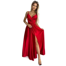 Dámské šaty 512-5 JULIET NUMOCO - červená barva - z lesklého, hladkého a lehce elastického saténu - elegantní maxi dlouhé šaty - na ramínka - překřížený výstřih - dlouhý rozparek - zapínání vzadu na zip - ideální na svatby, plesy, silvestra a podobné události