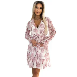 Dámské šaty 514-1 Numoco basic - ze vzdušného šifónového materiálu - se vzorem květin - dlouhé rukávy - výstřih - vázání páskem