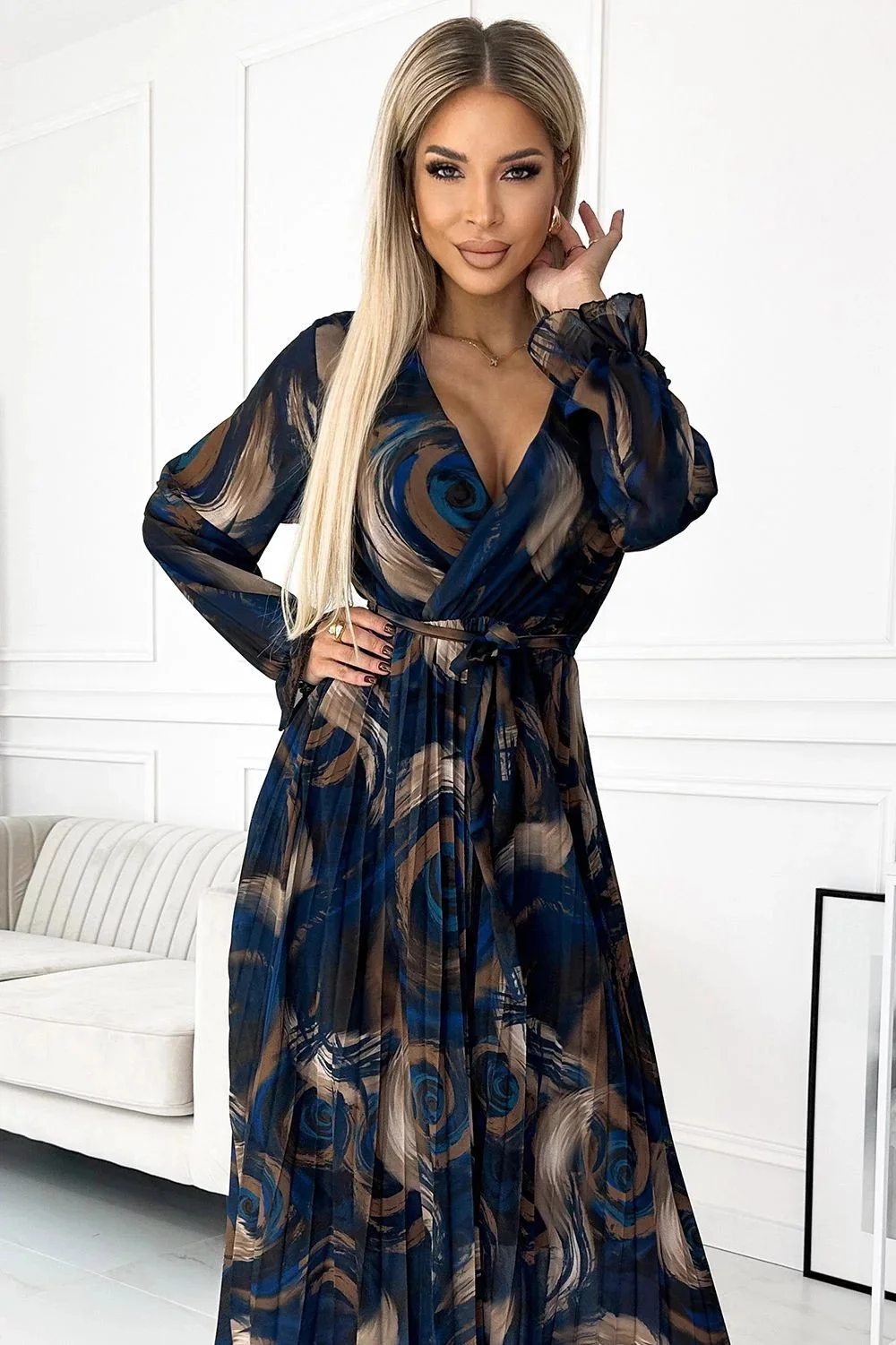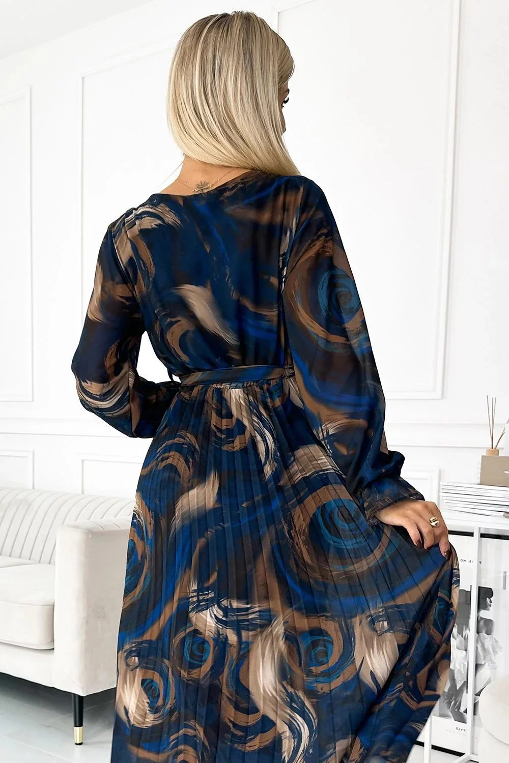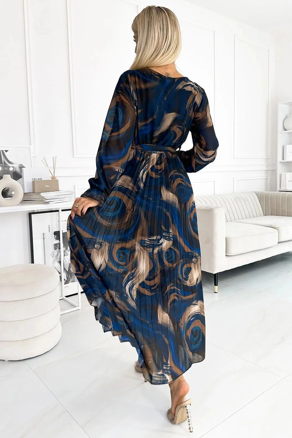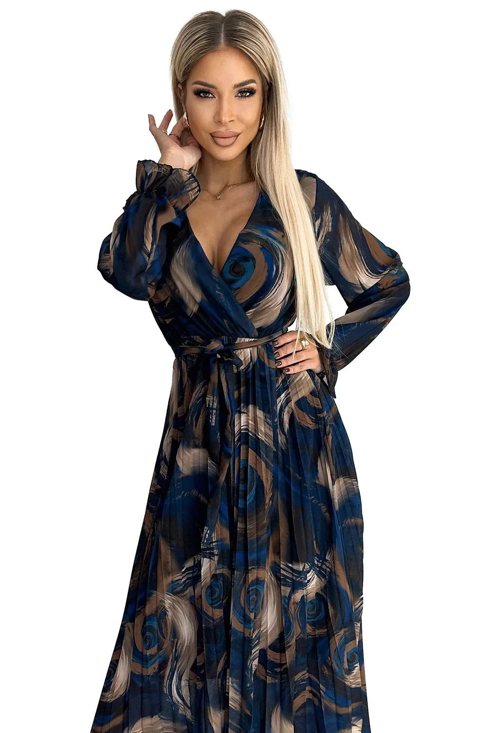 Dámské šaty 519-1 Numoco basic - modrá barva - ze šifónového materiálu s podšívkou - se vzorem béžových vln - dlouhé plisované šaty - psaníčkový výstřih - dlouhé rukávy - pásek na zavazování