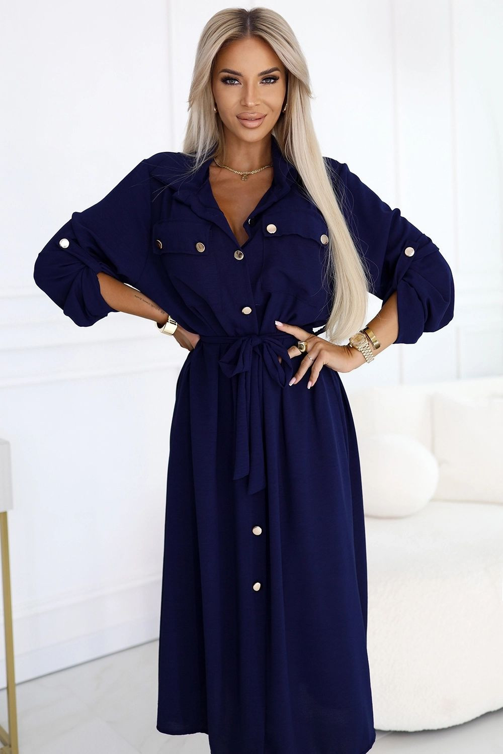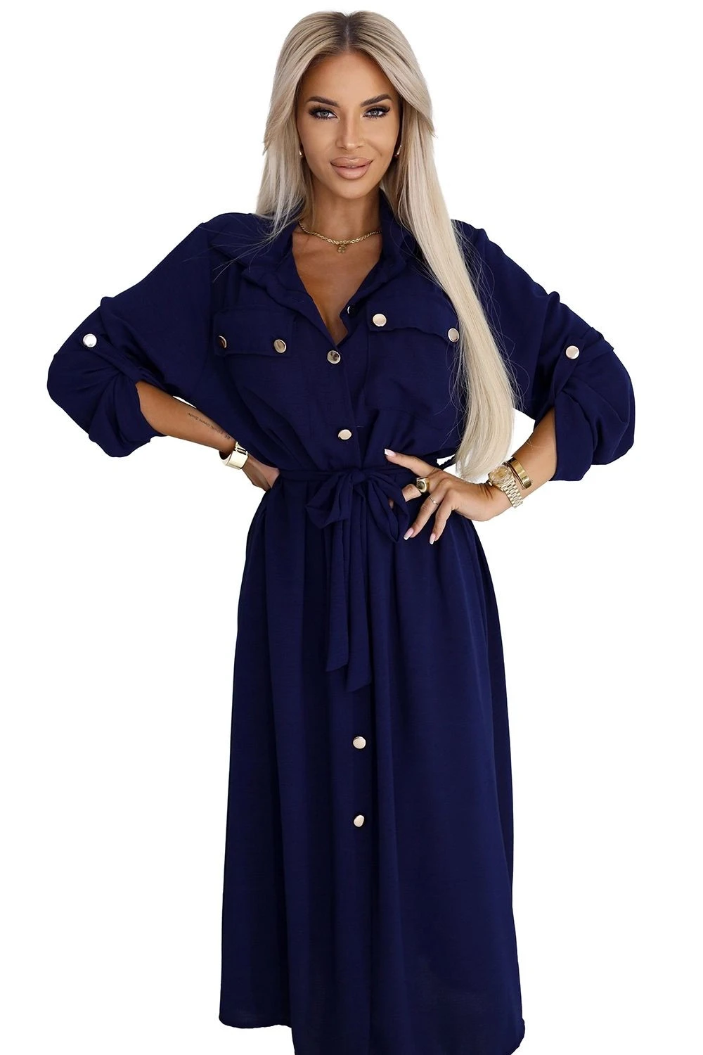 Dámské šaty 531-6 Numoco basic - tmavě modrá barva - košilový typ - zapínání na zlaté knoflíky - vázání v pase - zdobená kapsami - s límečkem