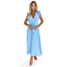 Dámské šaty 543-2 Numoco basic - modrá barva - z mačkaného vzdušného materiálu - plisované šaty - psaníčkový výstřih - široká ramínka zdobená volánky - zavazování na pásek