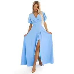 Dámské šaty 581-3 JENNIFER NUMOCO - světle modrá barva - z lesklého brokátu - krátké rukávy - psaníčkový výstřih - dlouhý rozparek - vypasovaný střih s páskem