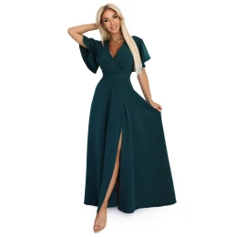 Dámské šaty 581-8 JENNIFER NUMOCO - zelená barva - z lesklého brokátu - krátké rukávy - psaníčkový výstřih - dlouhý rozparek - vypasovaný střih s páskem