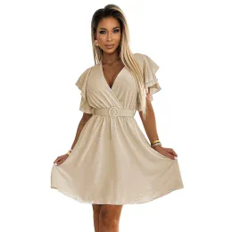Dámské šaty 586-1 Numoco basic - béžová barva - z mačkaného materiálu - volné krátké rukávy - zavinovací výstřih - ležérní sukně - široký pásek zvýrazňuje pas