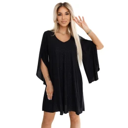 Dámské šaty 597-1 LIVIA NUMOCO - černá barva - z elastické látky se třpytkami - dlouhé motýlí rukávy - výstřih do V decentně zvýrazňuje krk a opticky prodlužuje horní část těla - trapézové šaty s volným střihem do tvaru A