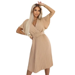 Dámské šaty 607-2 LYRA Numoco basic - béžová barva - z vysoce jakostního neelastického materiálu - hluboký výstřih ve tvaru písmene "V" - krátké volné rukávy - rozšířená plisovaná spodní část - široký pásek s ozdobnou přezkou