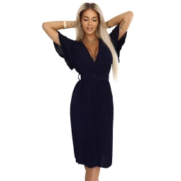 Dámské šaty 607-3 LYRA Numoco basic - tmavě modrá barva - z vysoce jakostního neelastického materiálu - hluboký výstřih ve tvaru písmene "V" - krátké volné rukávy - rozšířená plisovaná spodní část - široký pásek s ozdobnou přezkou