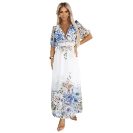 Dámské šaty 613-1 CELINA Numoco basic - bílá barva - s barevným květinovým potiskem - ze vzdušného materiálu - zavinovací výstřih zvýrazňuje poprsí - krátké volné rukávy - pásek v pase modeluje siluetu - maxi šaty s jemným ombré efektem - ideální na léto, dovolenou, zahradní párty nebo večeři