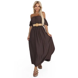 Dámské šaty 614-1 Numoco basic - čokoládová barva - ze vzdušného prodyšného materiálu - odhalená ramena - krátké rukávy typu puff - elastická vrchní část zajišťuje pohodlí nošení - pletený pásek s ozdobnou sponou - stylové maxi šaty jdou ideální na letní dny, procházky a prázdninové výlety