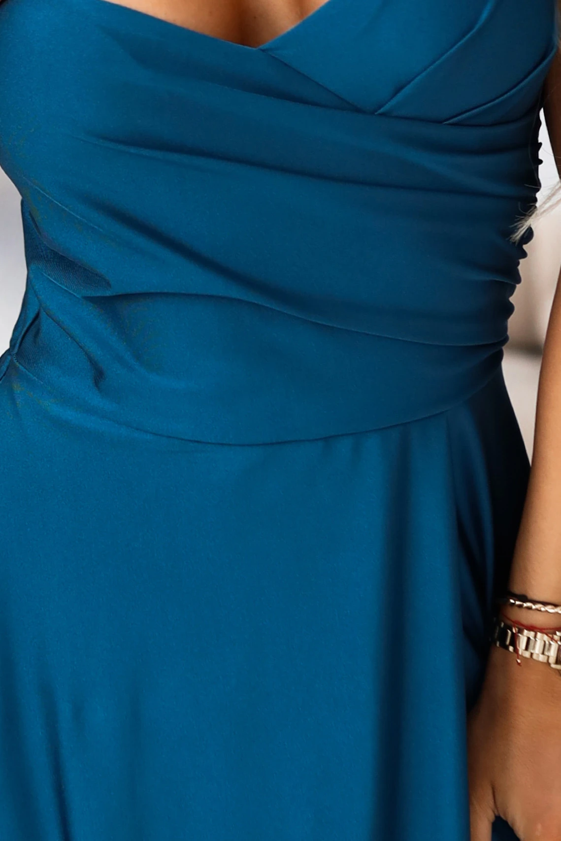 Horní díl s tenkými ramínky je zakončen obepínajícím řasením - krásně sedí na poprsí a vytváří elegantní, ženský dekolt. Šaty jsou v pase vypasované a níže přecházejí do dlouhé, splývavé sukně, která jemně pracuje s pohybem a opticky zeštíhluje siluetu, zejména v kombinaci s jehlovými podpatky.