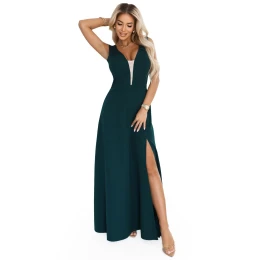 Dámské šaty 648-1 NUMOCO - zelená barva - hluboký smyslný výstřih s vsadkou - opticky zeštíhluje horní část - široká ramínka - elegantní dlouhé maxi šaty - rozparek na noze - ideální na svatby, maturitní plesy a elegantní večírky