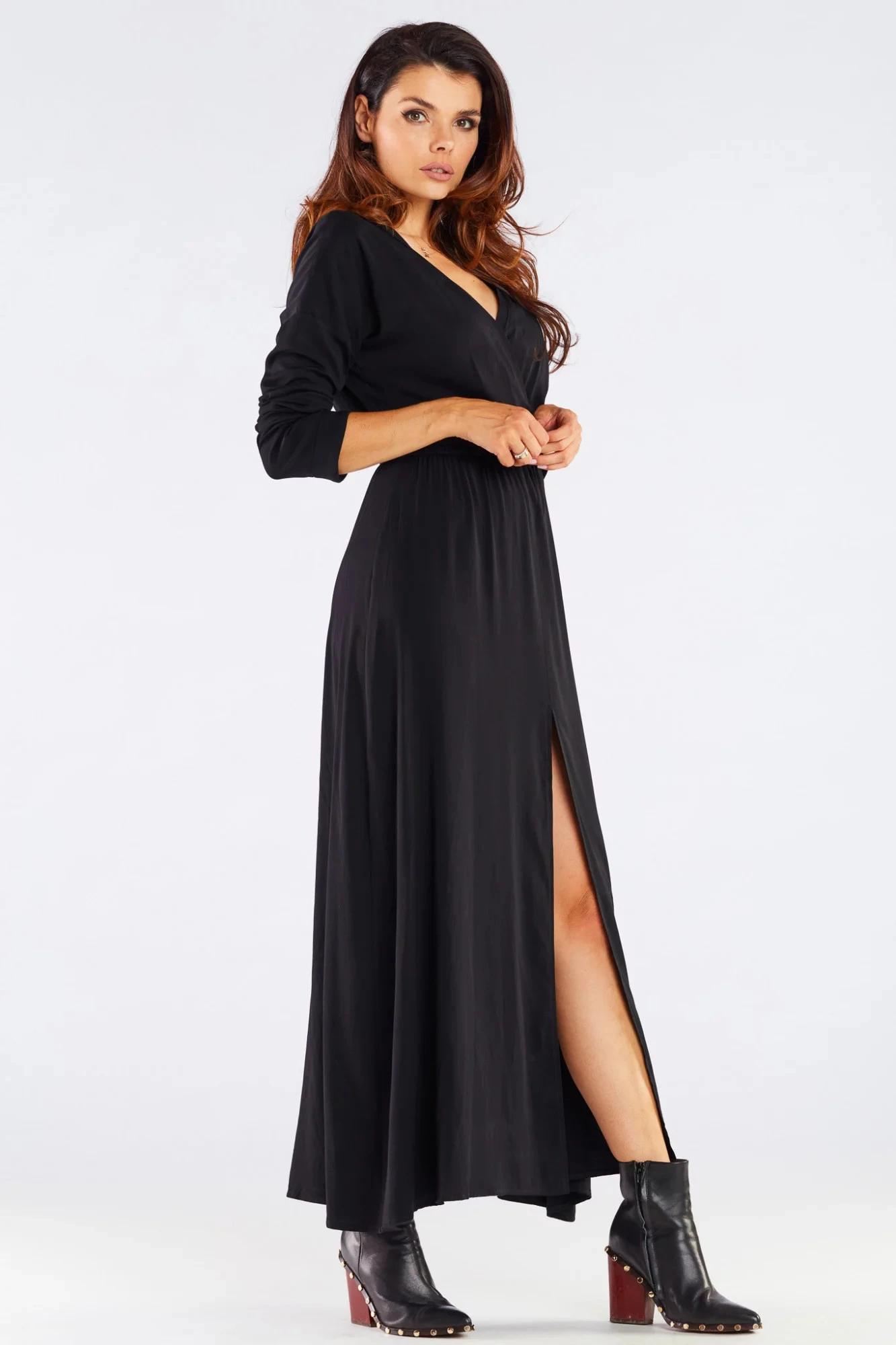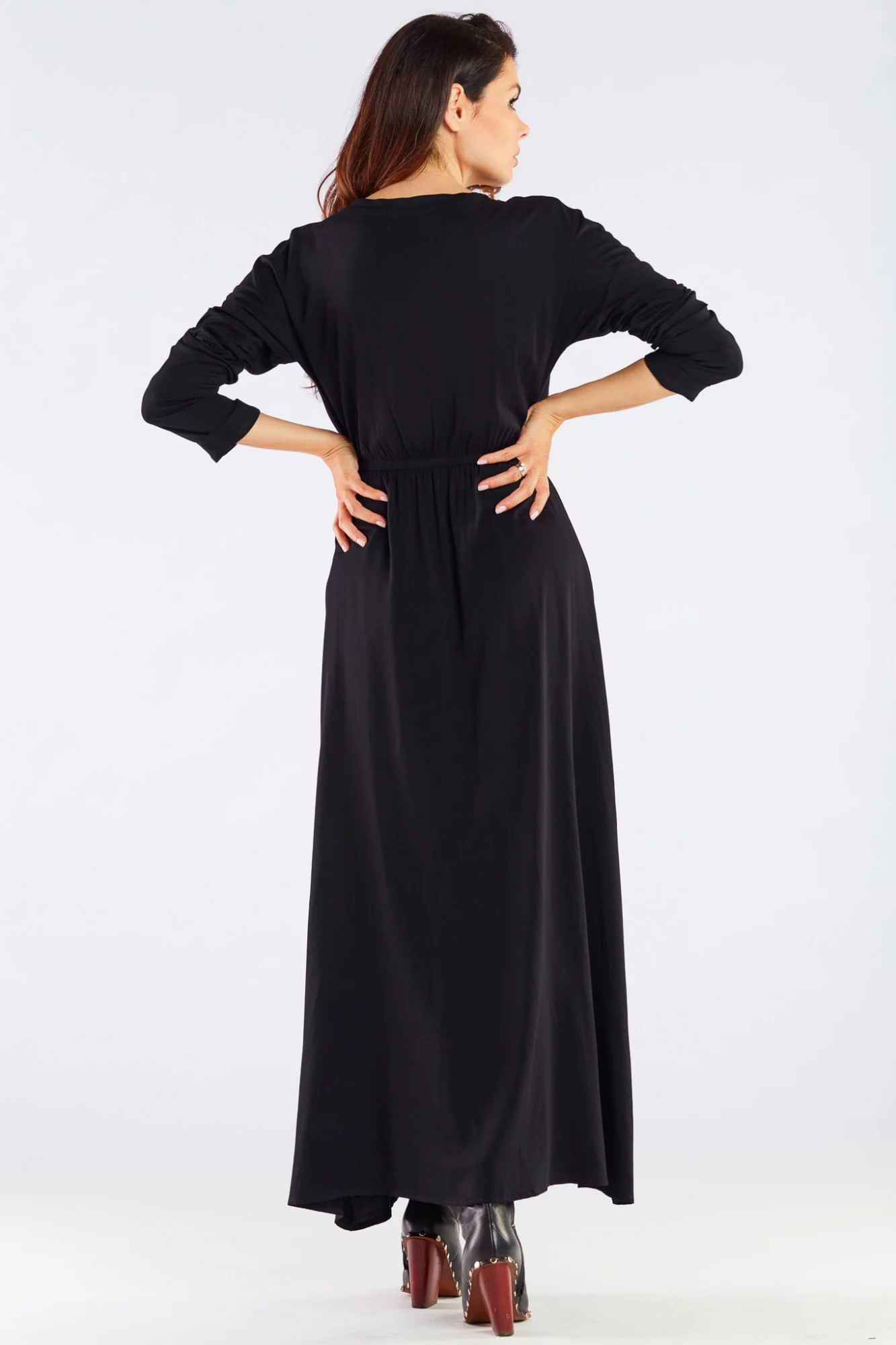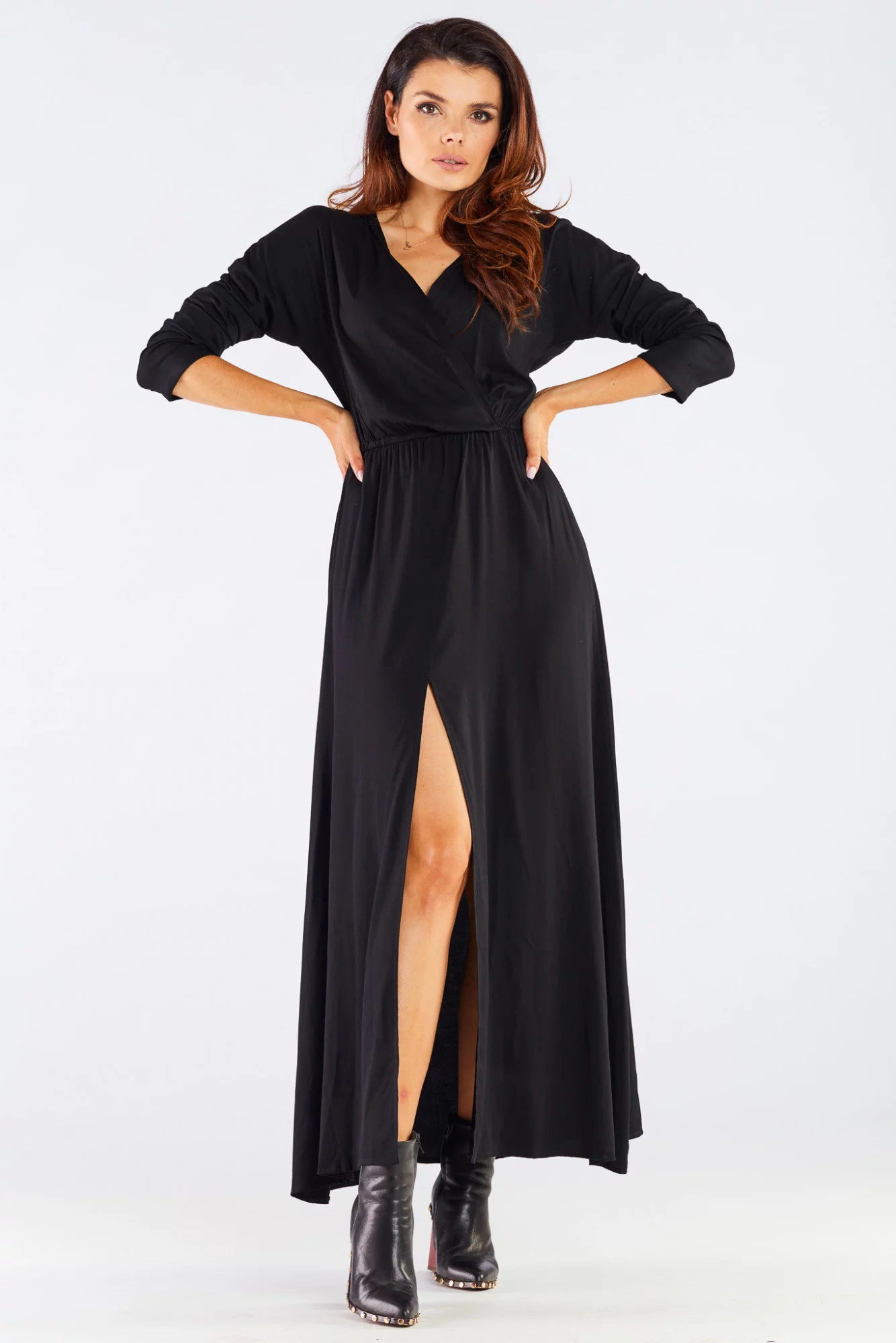 Maxi, mimořádně ženské šaty. Dlouhé rukávy a délka jsou ideální pro chladnější dny. V kombinaci s kozačkami a koženou bundou bude dokonalým řešením na rande, do práce nebo na setkání s přáteli. Zip na přední straně dodává šarm a ženskost. Vyrobeno z přírodní, tělu příjemné viskózy. Produkt je vyroben v Polsku.