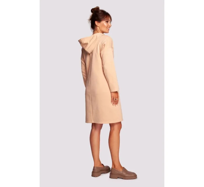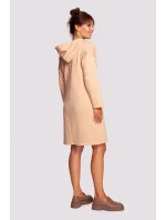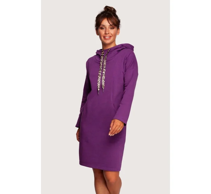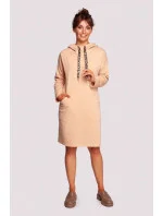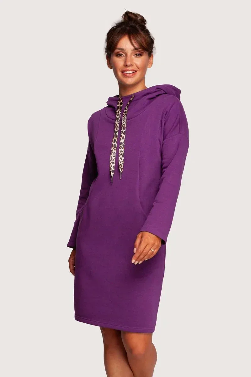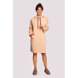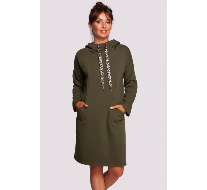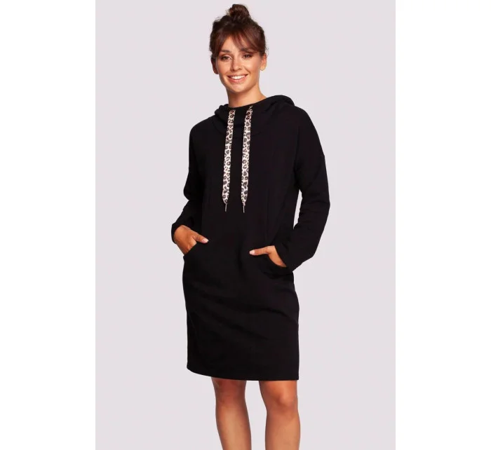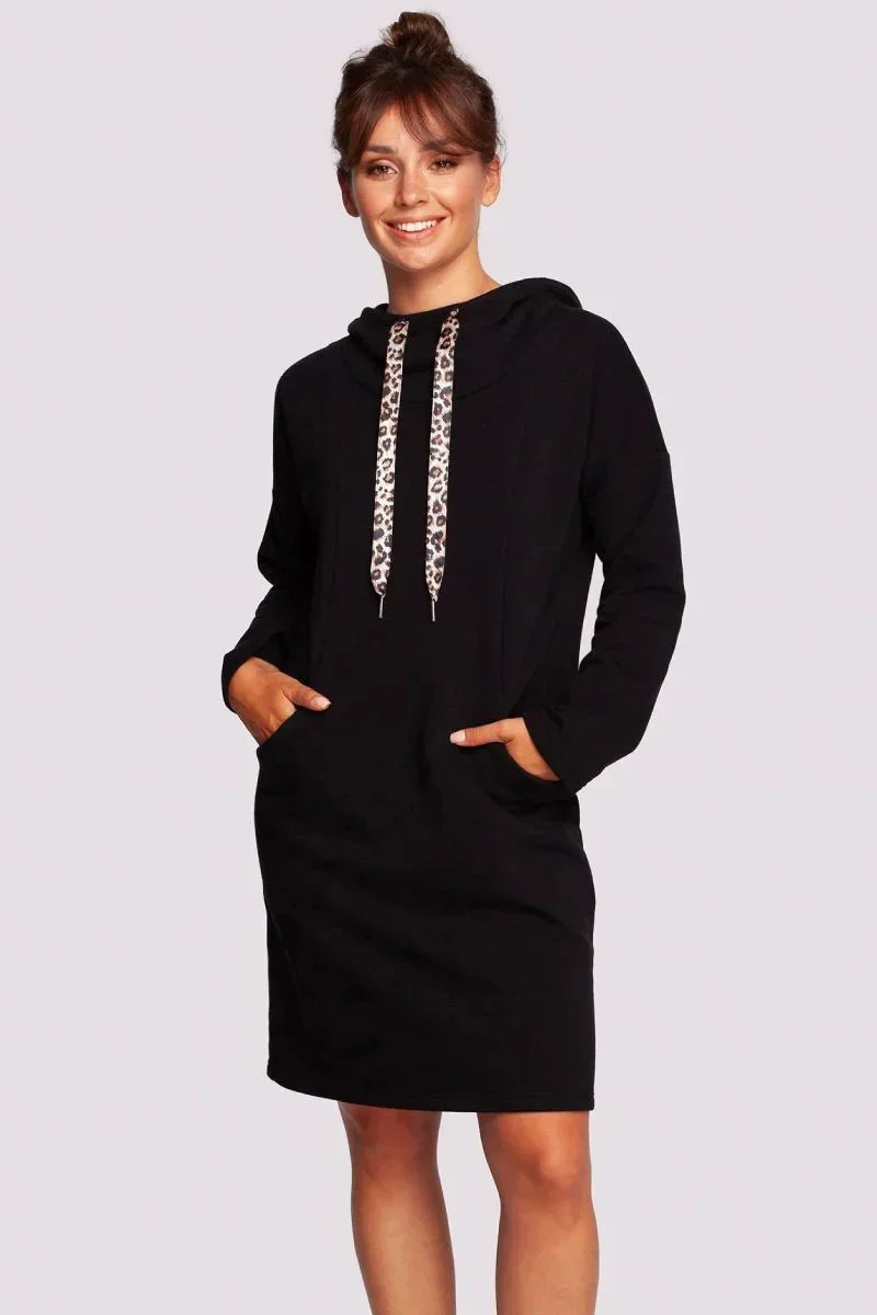 Pohodlné šaty pro každodenní nošení s vysokým límcem, ozdobnými stuhami s leopardím vzorem, kapucí a kapsami skrytými ve švech na předním díle. Pletenina přizpůsobená tělu zajistí pocit tepla a pohodlí.