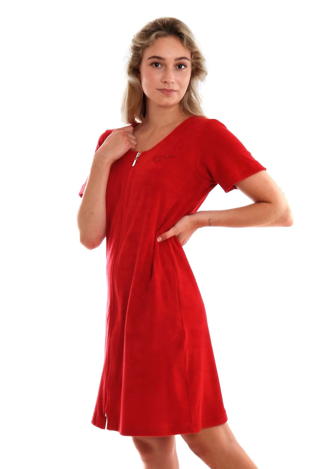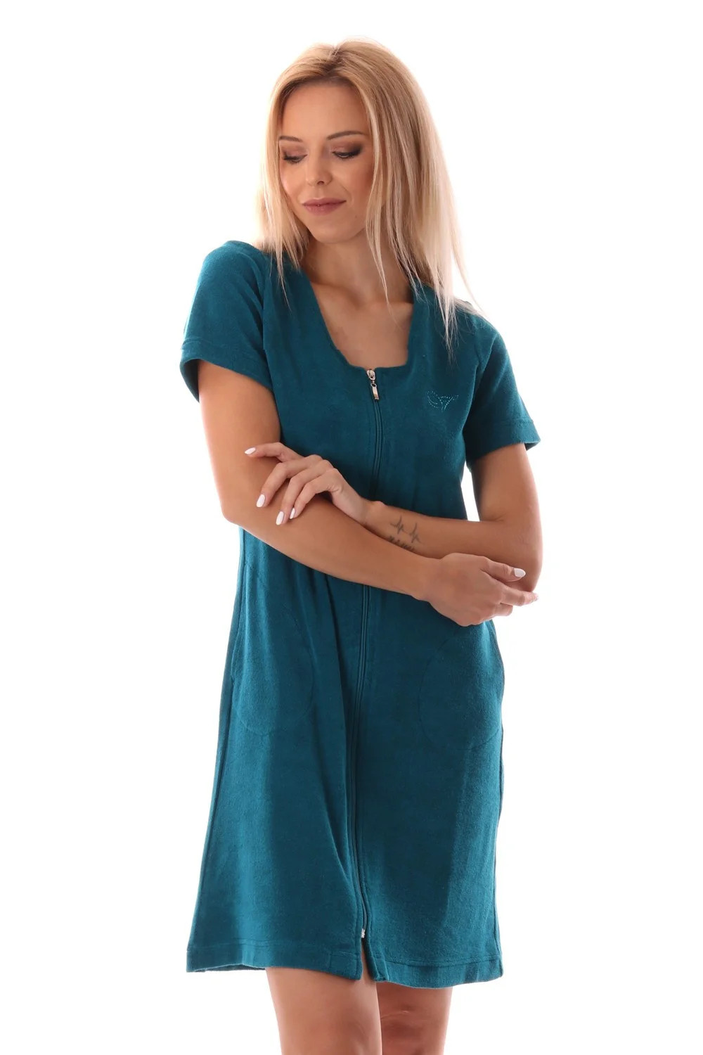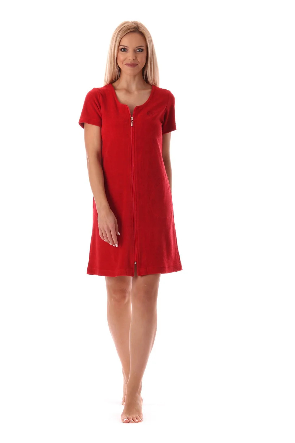 Krátké froté letní domácí šaty Bari mají pohodlný mírně projmutý střih, který díky pružnému materiálu sedne každé postavě. Zapínání na zip umožňuje rychlé oblékání a svlékání a zároveň zajišťuje , že se šaty nebudou při pohybu nechtěně rozevírat a vy se můžete v klidu věnovat svým aktivitám. Úpletové froté ve složení 80% bavlna a 20% polyester je příjemné na nošení a nenáročné na údržbu.