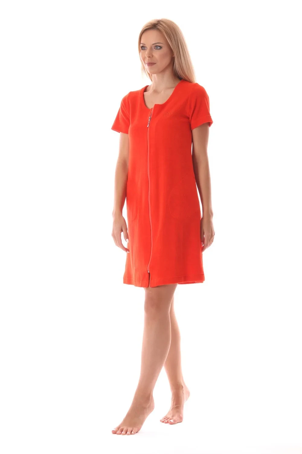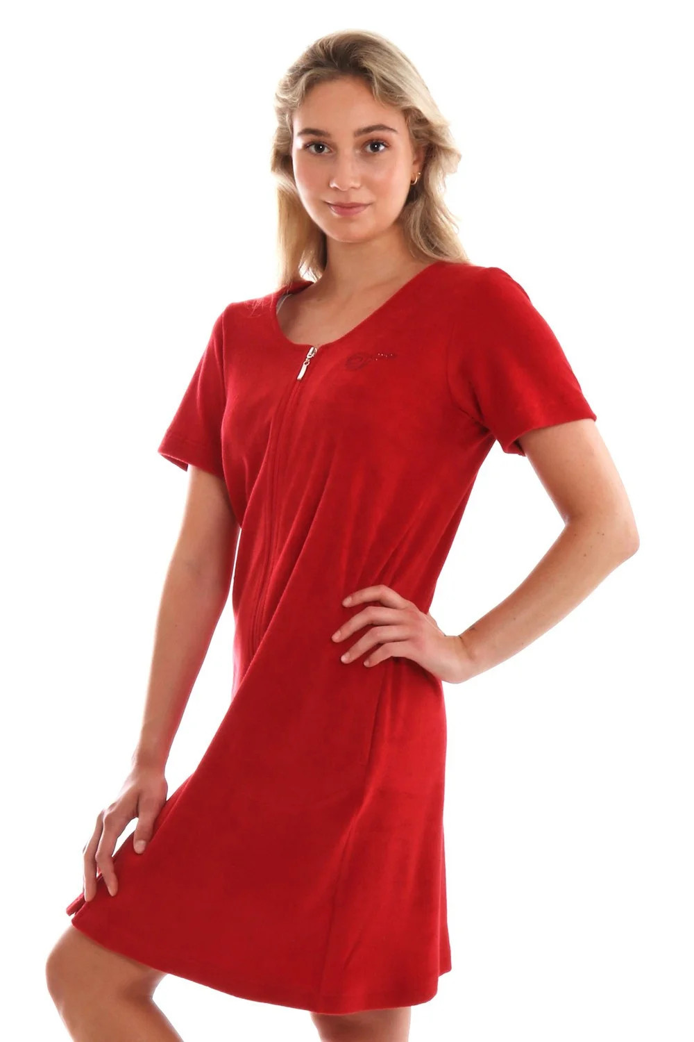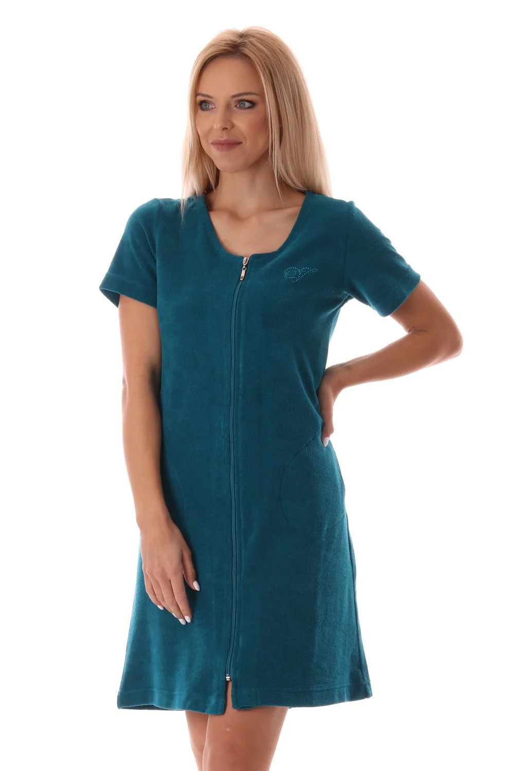 Krátké froté letní domácí šaty Bari mají pohodlný mírně projmutý střih, který díky pružnému materiálu sedne každé postavě. Zapínání na zip umožňuje rychlé oblékání a svlékání a zároveň zajišťuje , že se šaty nebudou při pohybu nechtěně rozevírat a vy se můžete v klidu věnovat svým aktivitám. Úpletové froté ve složení 80% bavlna a 20% polyester je příjemné na nošení a nenáročné na údržbu.
