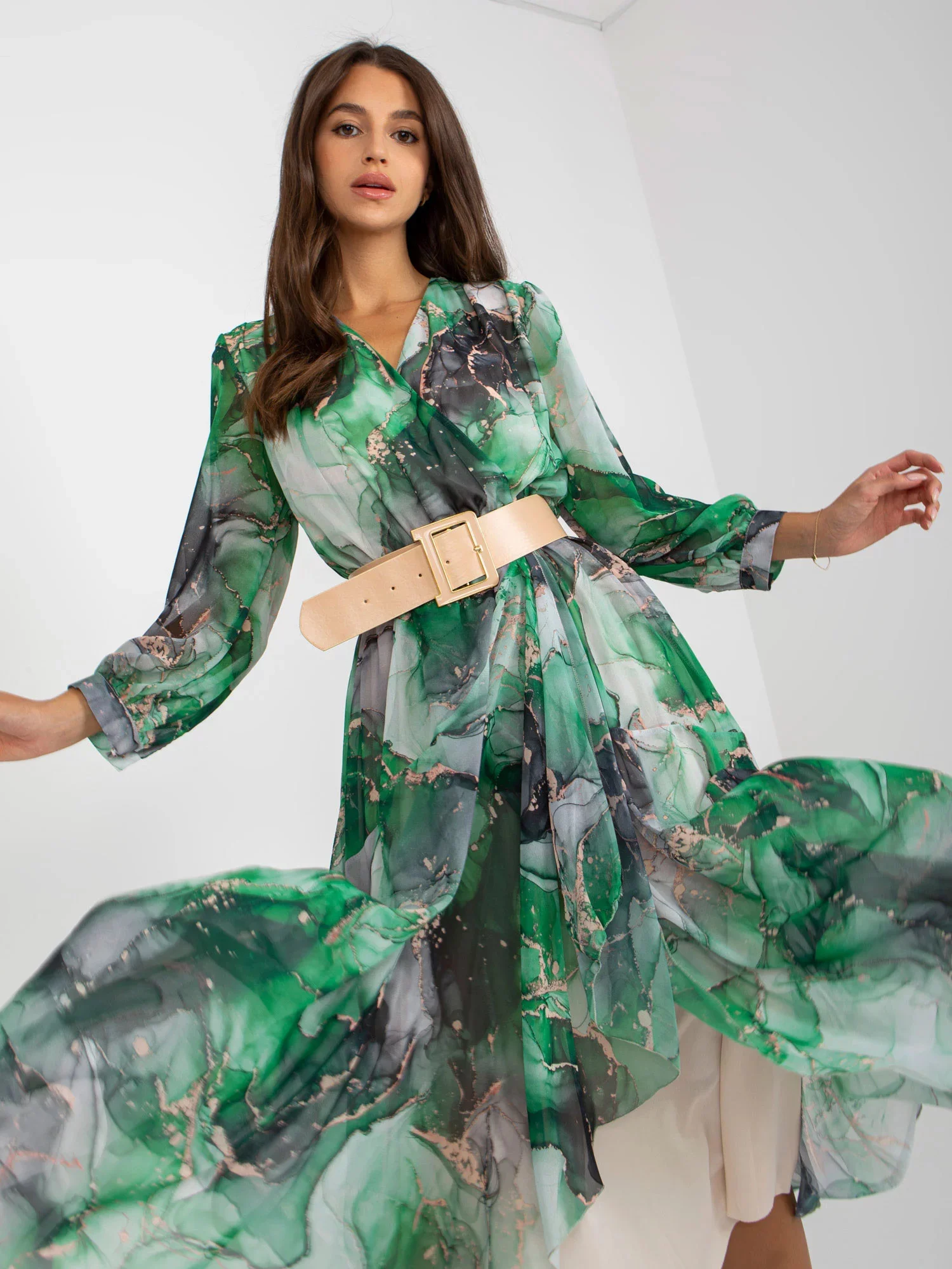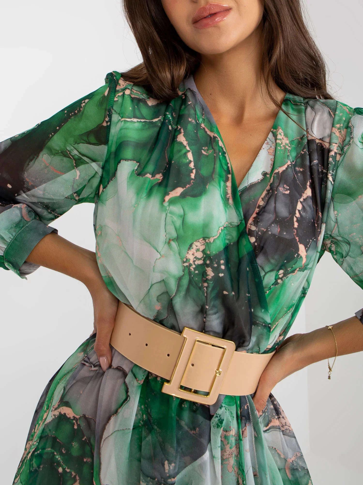 Modelka má na sobě velikost S. Rozměry modelky: výška 172 cm, poprsí 88 cm, pas 63 cm, boky 92 cm.