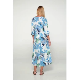 Dlouhý kaftan s krátkými rukávy, výstřihem do V a záhyby pro větší pohodlí. Krásný, zářivý květinový vzor, který můžete nosit celé léto.