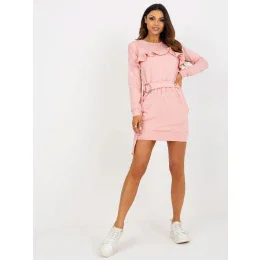 Světle růžové mini teplákové šaty s volánky a páskem .