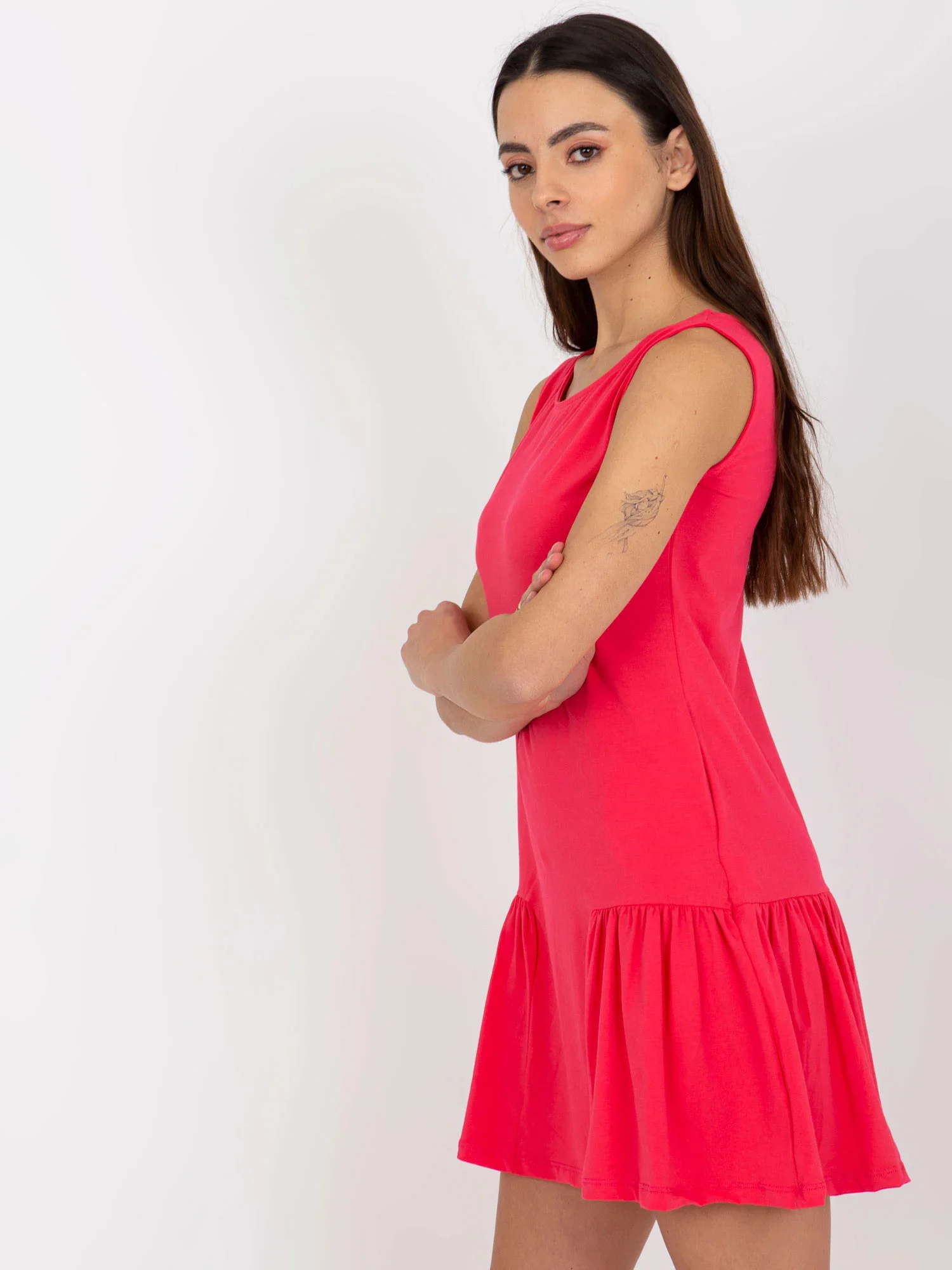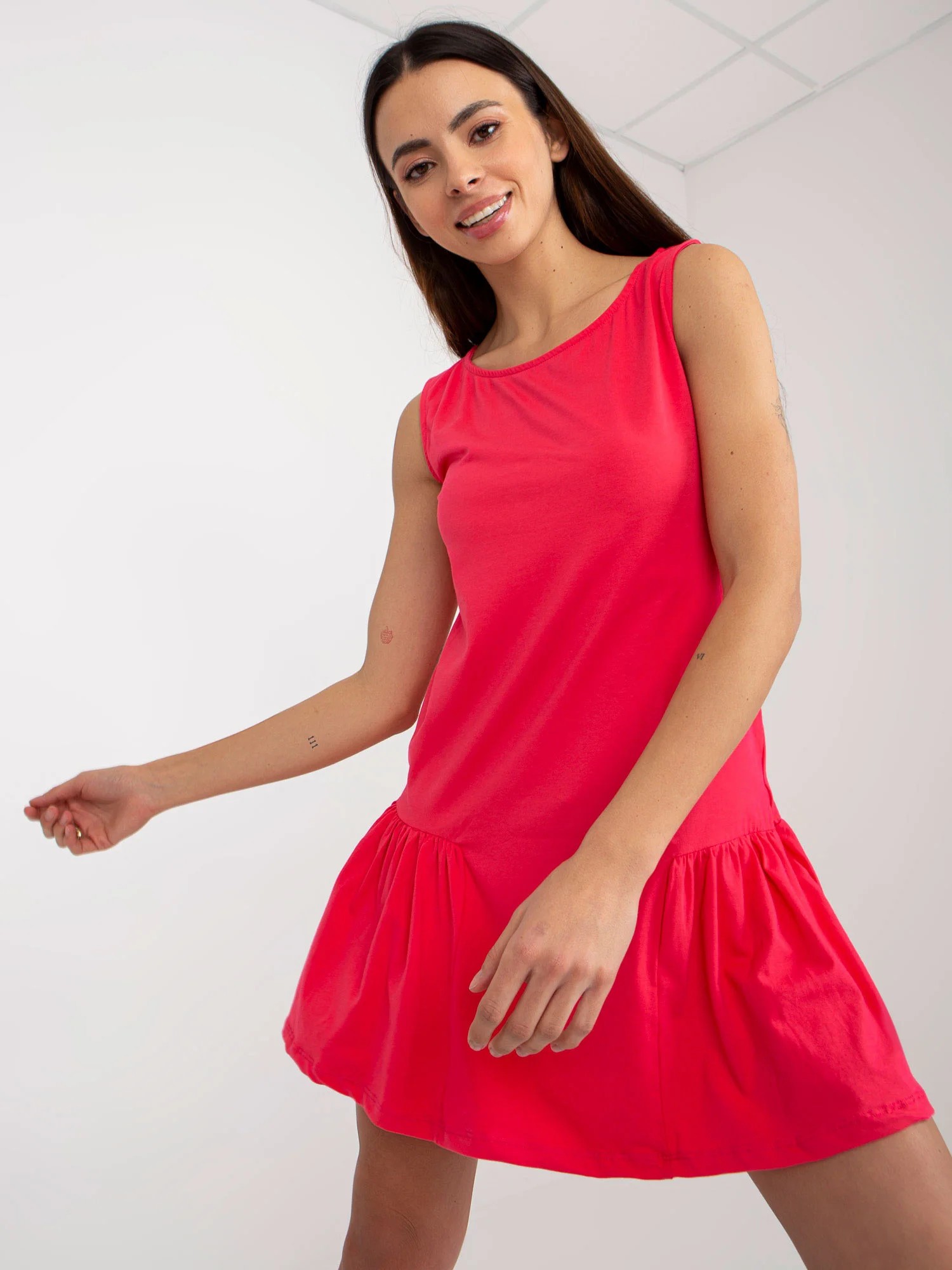 Bílé základní mini šaty bez rukávů s volánkem .
