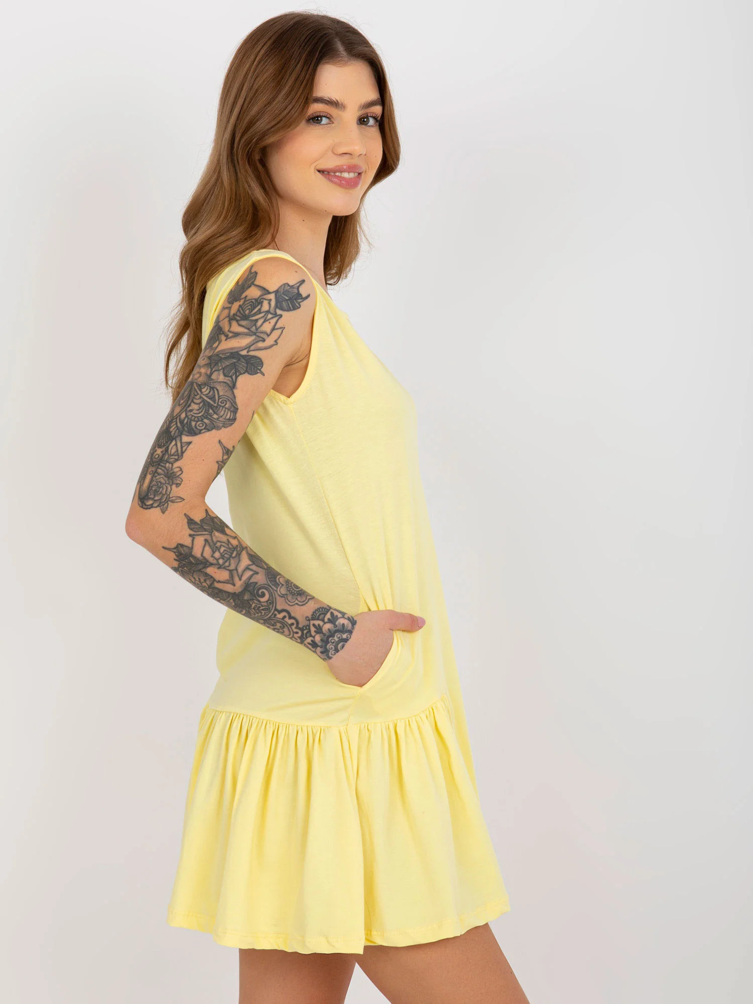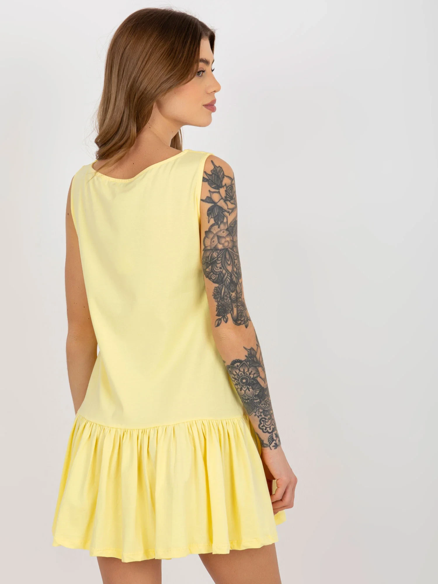 Zářivě žluté základní mini šaty bez rukávů s volánkem .