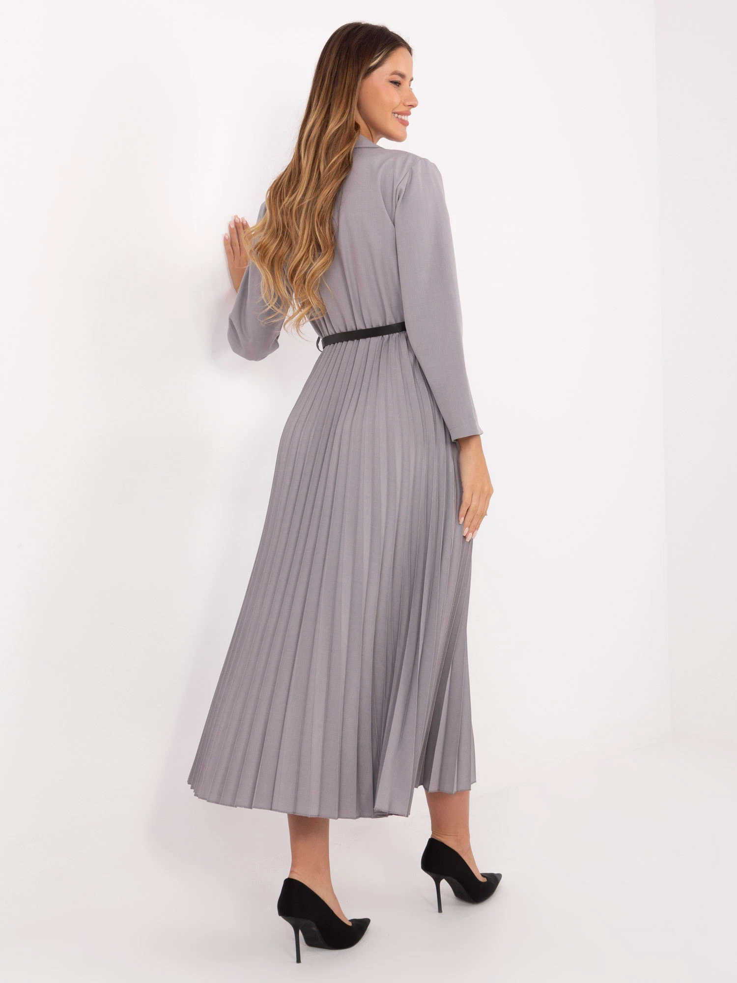 - pas je doplněn úzkým páskem s ozdobnou sponou, který dodává modelu ženskost a eleganci
