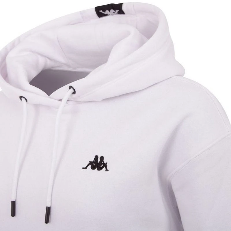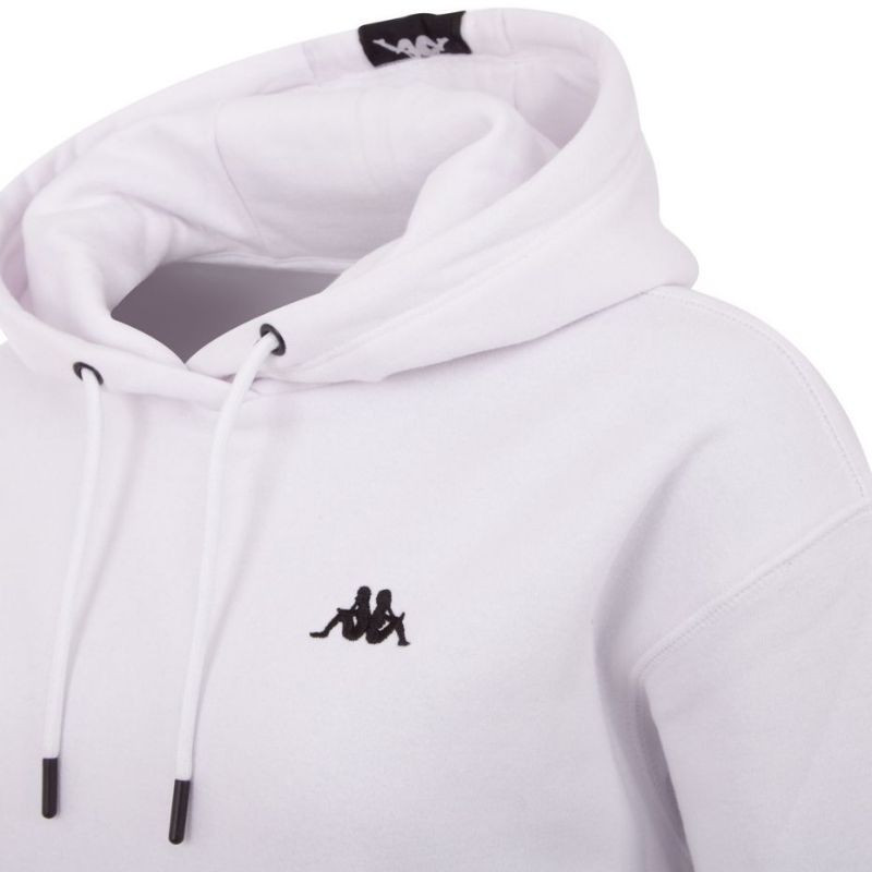 - Model v bílé barvě s ozdobnou páskou na kapuci a jemným logem výrobce na přední straně.