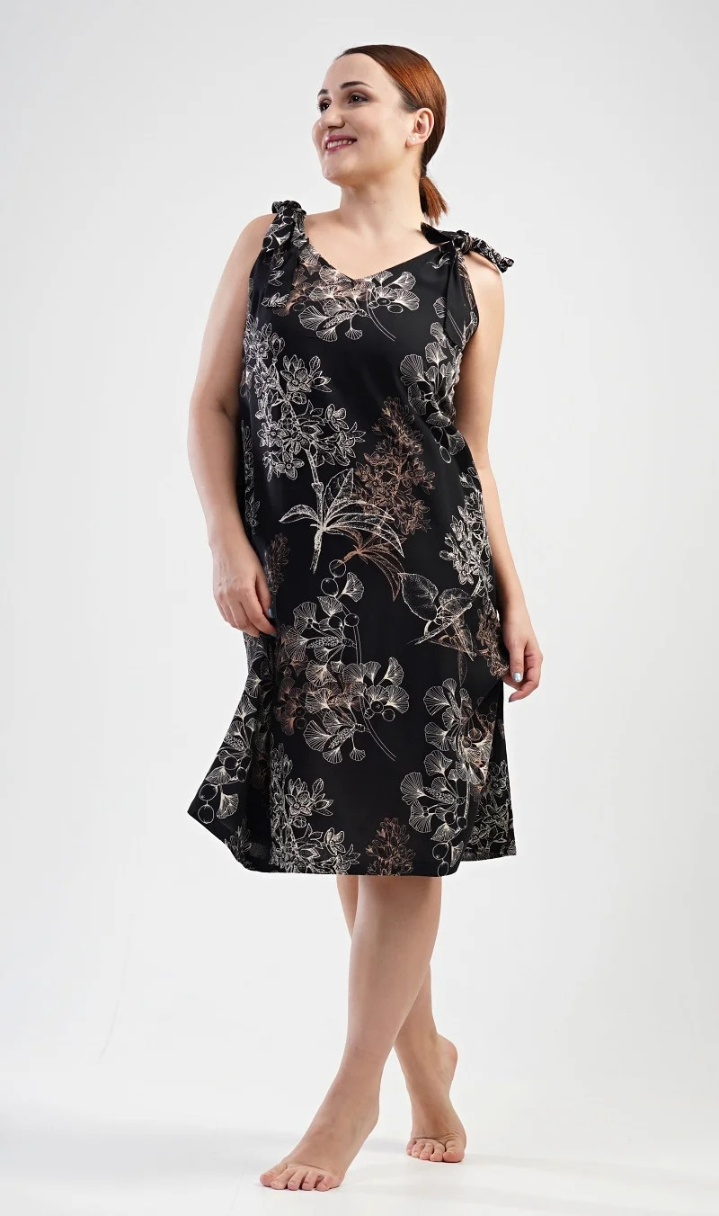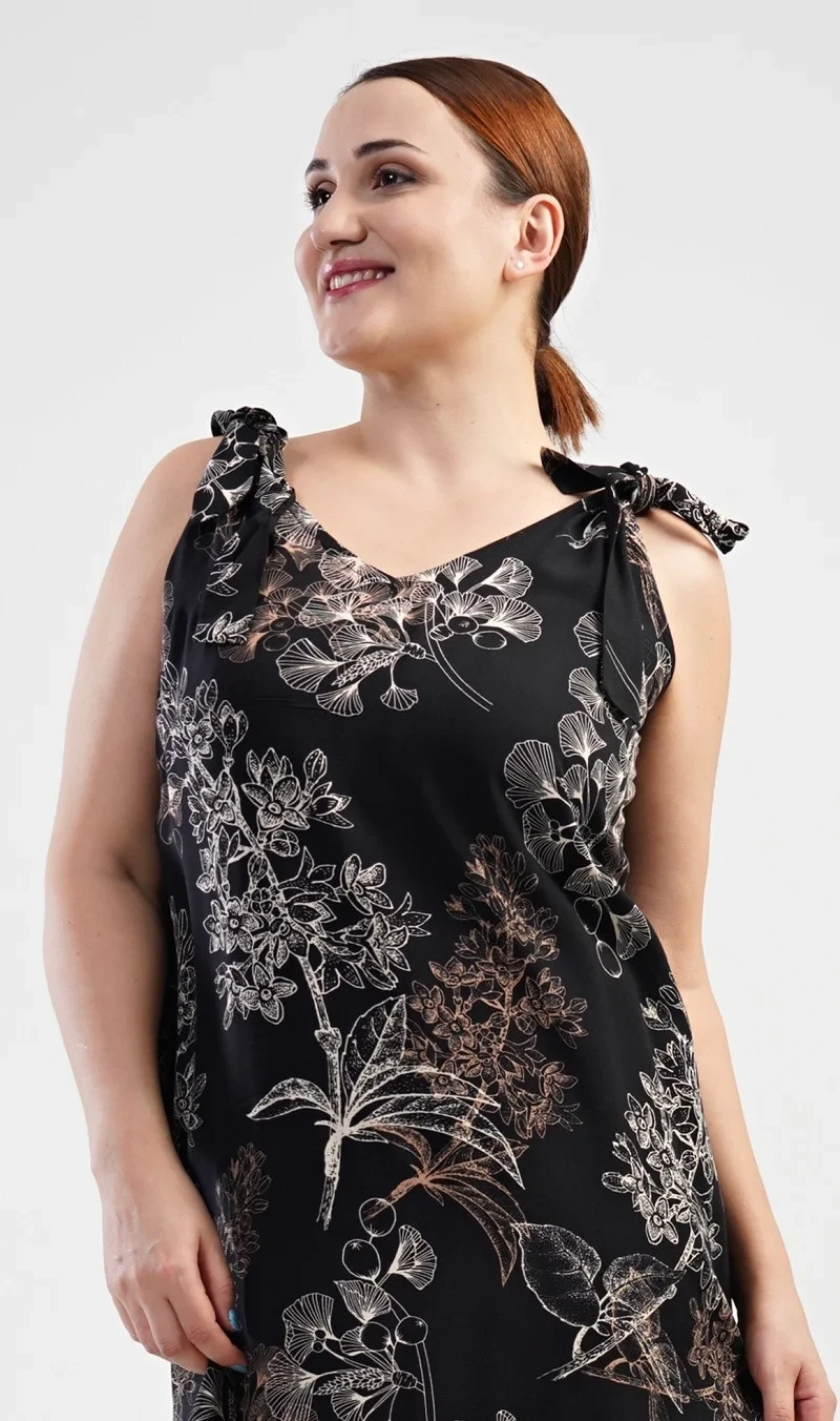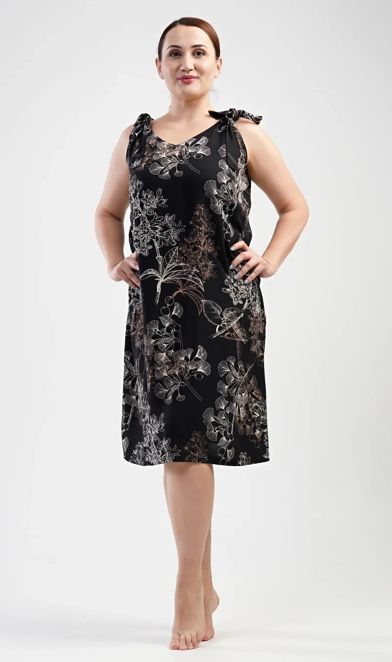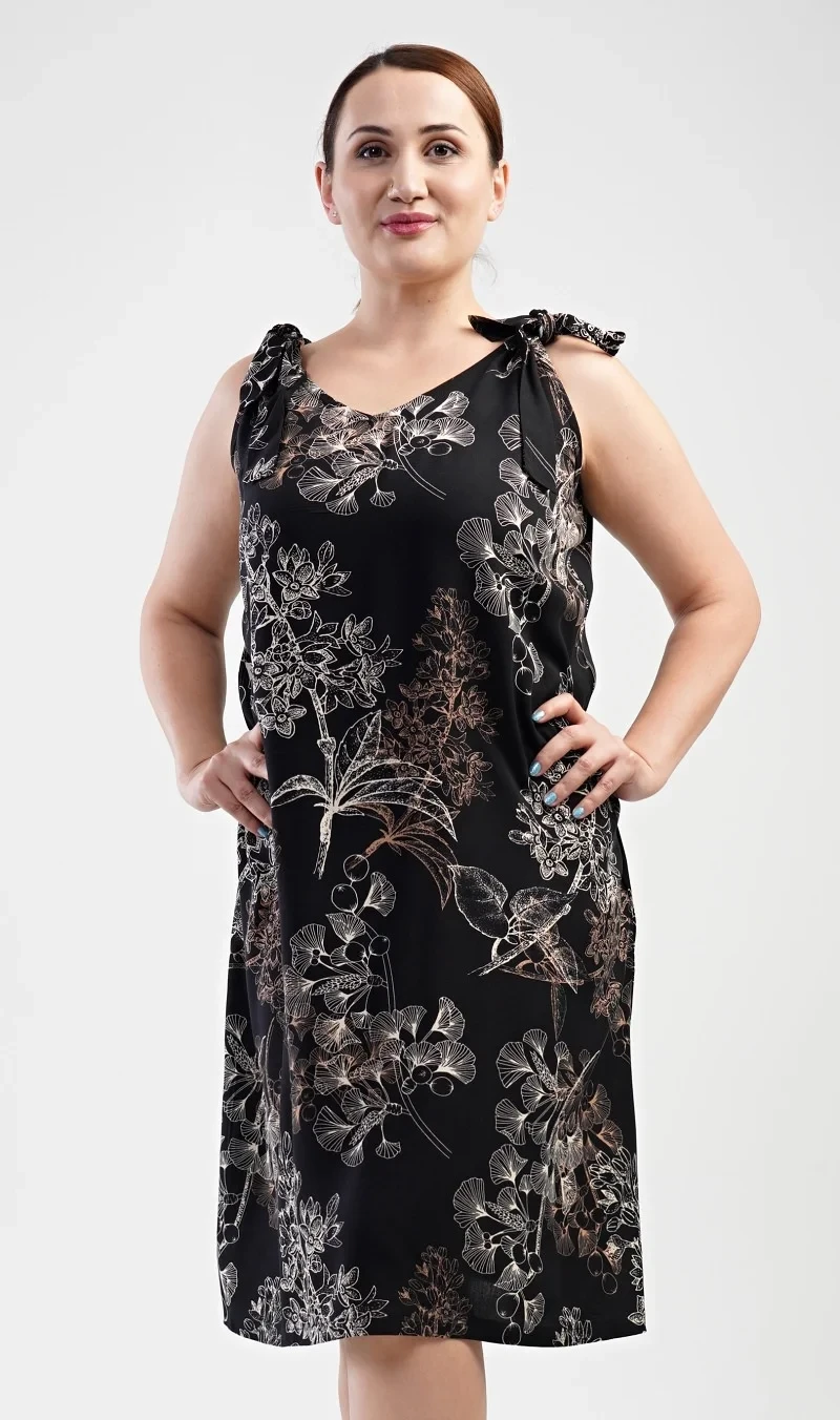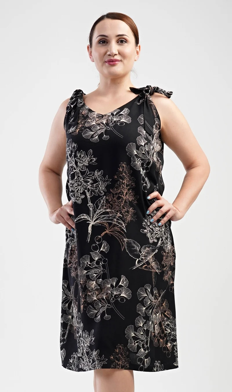 Dámské domácí šaty Kate. Dámské šaty s florálním potiskem na tmavém podkladu mají příjemnou délku ke kolenům a zajímavé zavazování ramínek. Použitý materiál je příjemný na dotek. Šaty jsou univerzální - vhodné na doma, na pláž a ostudu si s nimi neuděláte ani v kanceláři.
