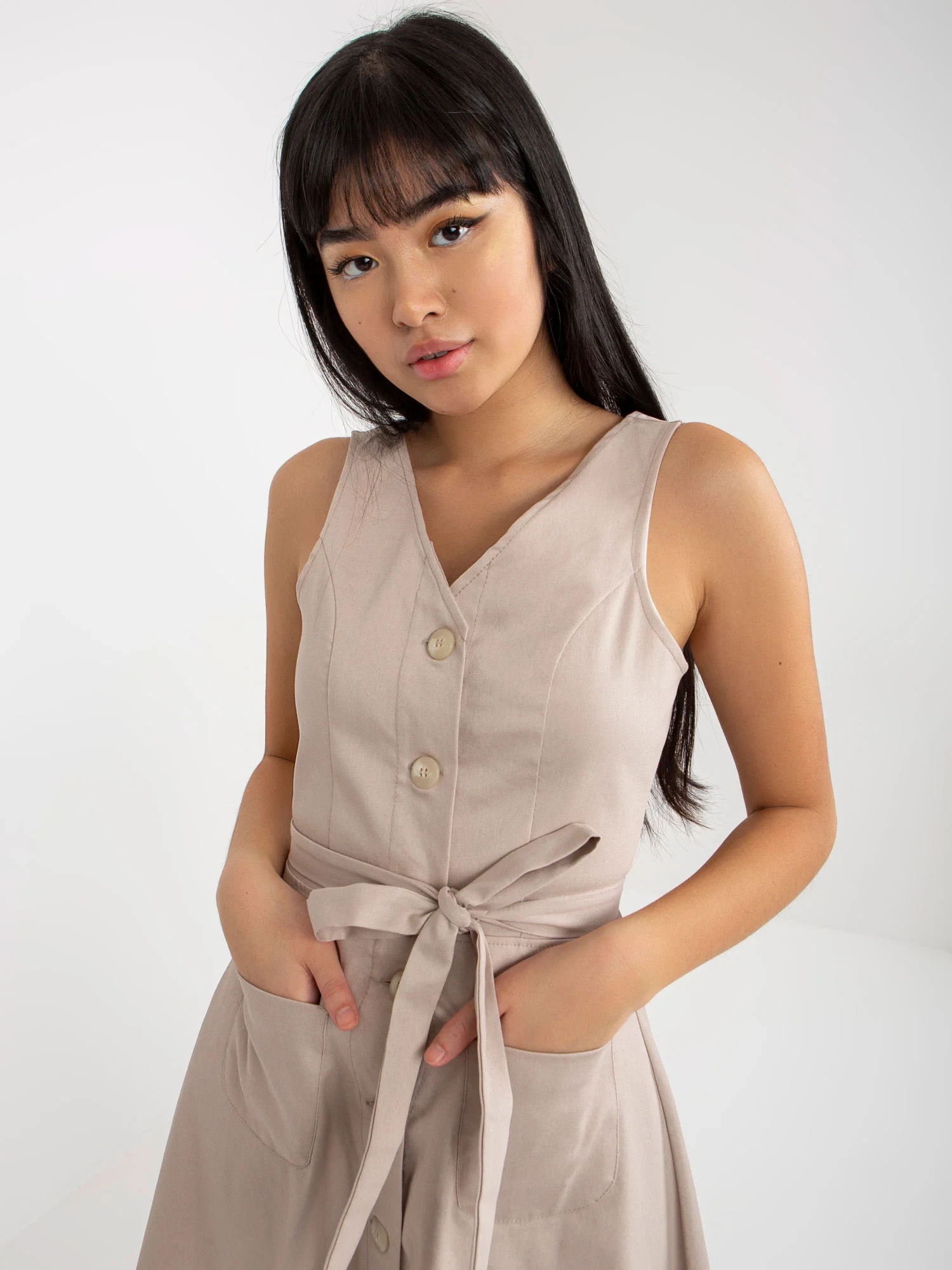 Béžové rozšířené džínové šaty s knoflíky .