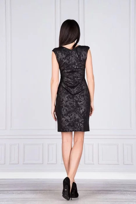 Dámské šaty z kolekce jaro/léto 2017. Vypasovaný model s krátkými rukávky a dekoltem do V. Jednoduchý střih je doplněný zajímavým materiálem, ze kterého jsou šaty vyrobené. Modelka na obrázku měří 170 cm a předvádí model ve velikosti 36/38. Elastan 8% Bavlna 28% Viskóza 34% Polyester 30%