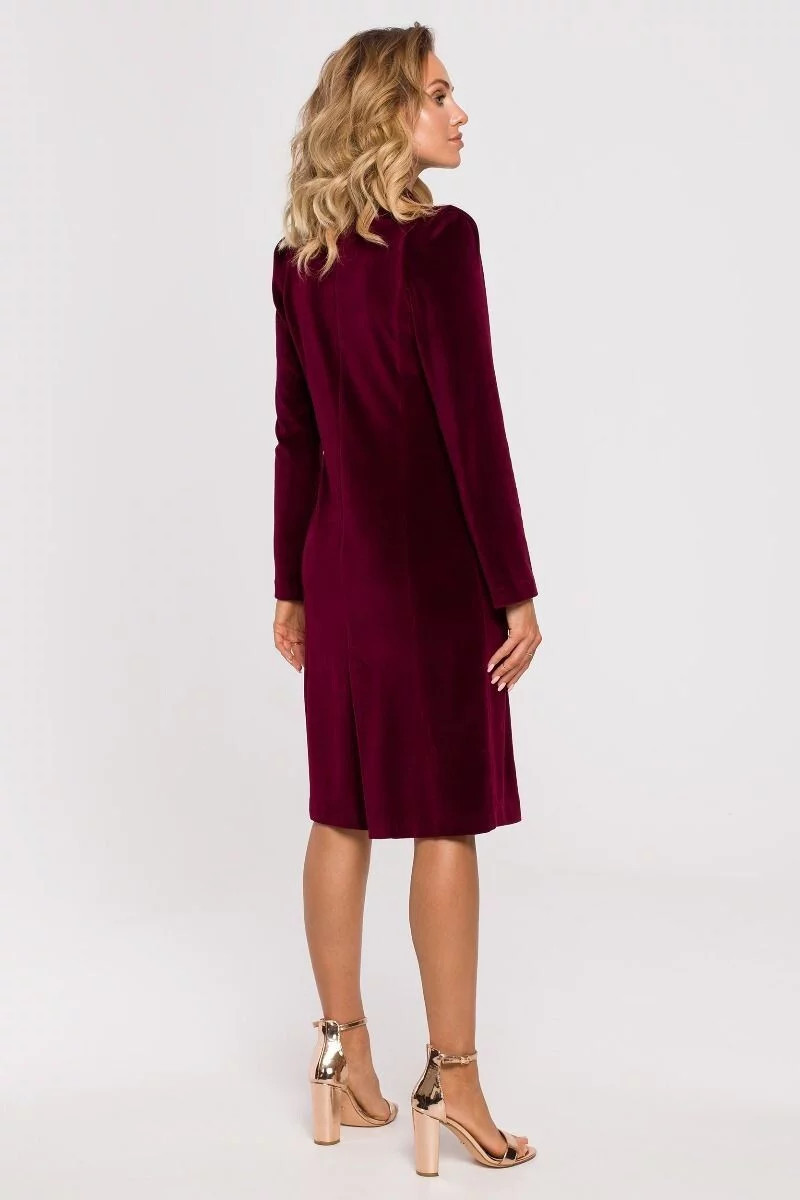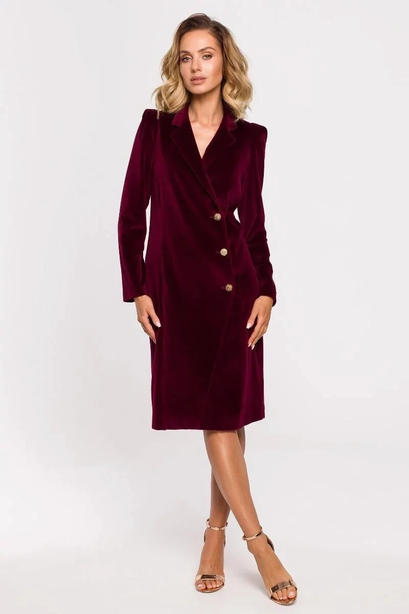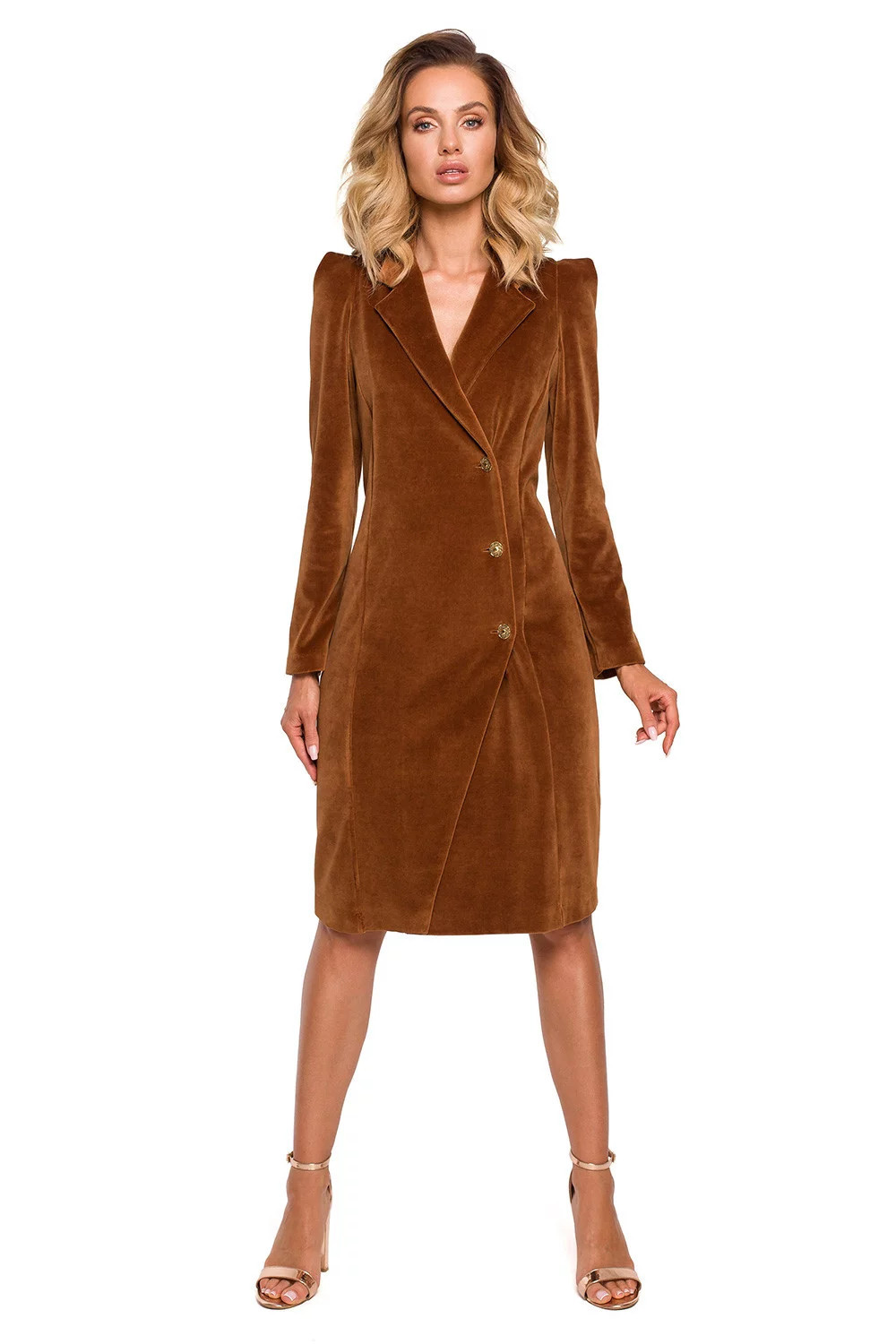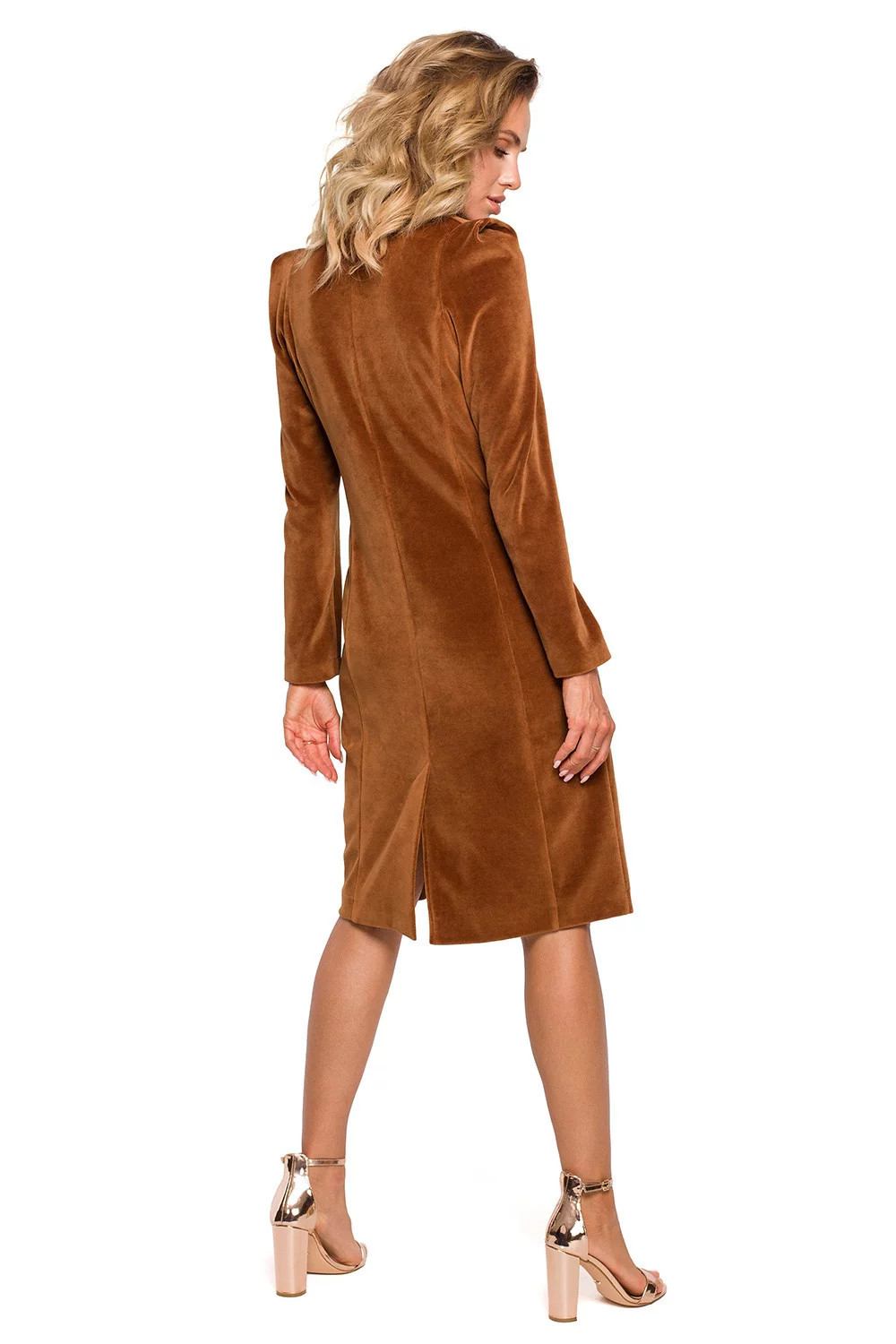 Klasický střih a detaily. Velurové bundové šaty s límcem, ozdobnými zlatými knoflíky a asymetrickým předním dílem. Šaty bez podšívky.