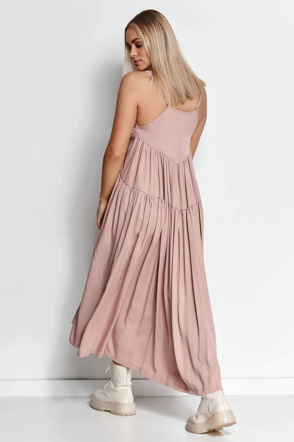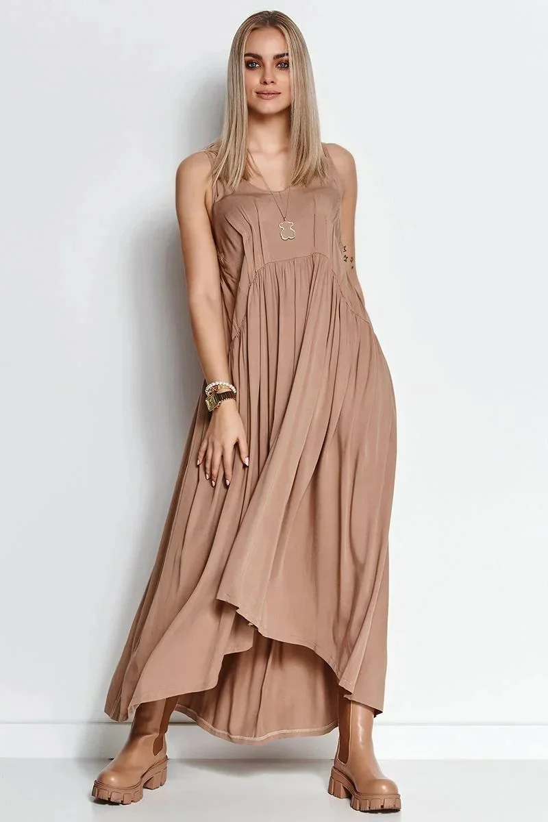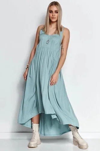 Krásné letní šaty ze vzdušné viskózy rozzáří váš den. Je lehká a vzdušná, díky čemuž vypadá při nošení krásně. Zvláště ve společnosti letního větru. Přední část je o něco kratší než zadní. V horní přední části jsou šaty zdobeny jemným řasením, které zvýrazňuje poprsí. Kromě toho má dvojité tenké ramenní popruhy. Šaty zakryjí nedokonalosti v oblasti břicha, stehen a hýždí a budete se v nich cítit velmi pohodlně. Ať už v něm strávíte pár hodin, nebo celý den. Skvěle se hodí k letním sandálům, dlouhému volnému svetru a prázdninové náladě. Zkombinujte je s elegantními jehlovými podpatky a oblíbenými perlami a během romantické večeře zazáříte.