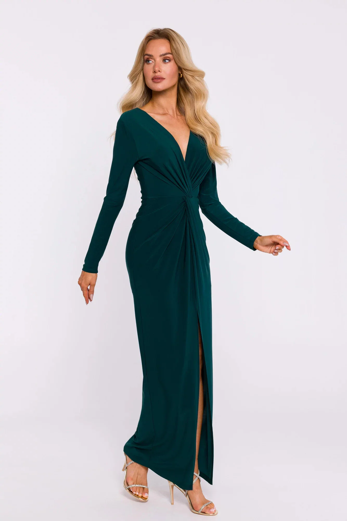 Pletenina, elastické maxi šaty s uzlem vpředu, výstřih ve tvaru V, vysoký rozparek vpředu, modelující záhyby vzadu, skrytý boční zip, bez podšívky, naše modelka měří 171 cm a nosí velikost S, navrženo a vyrobeno v Polsku .