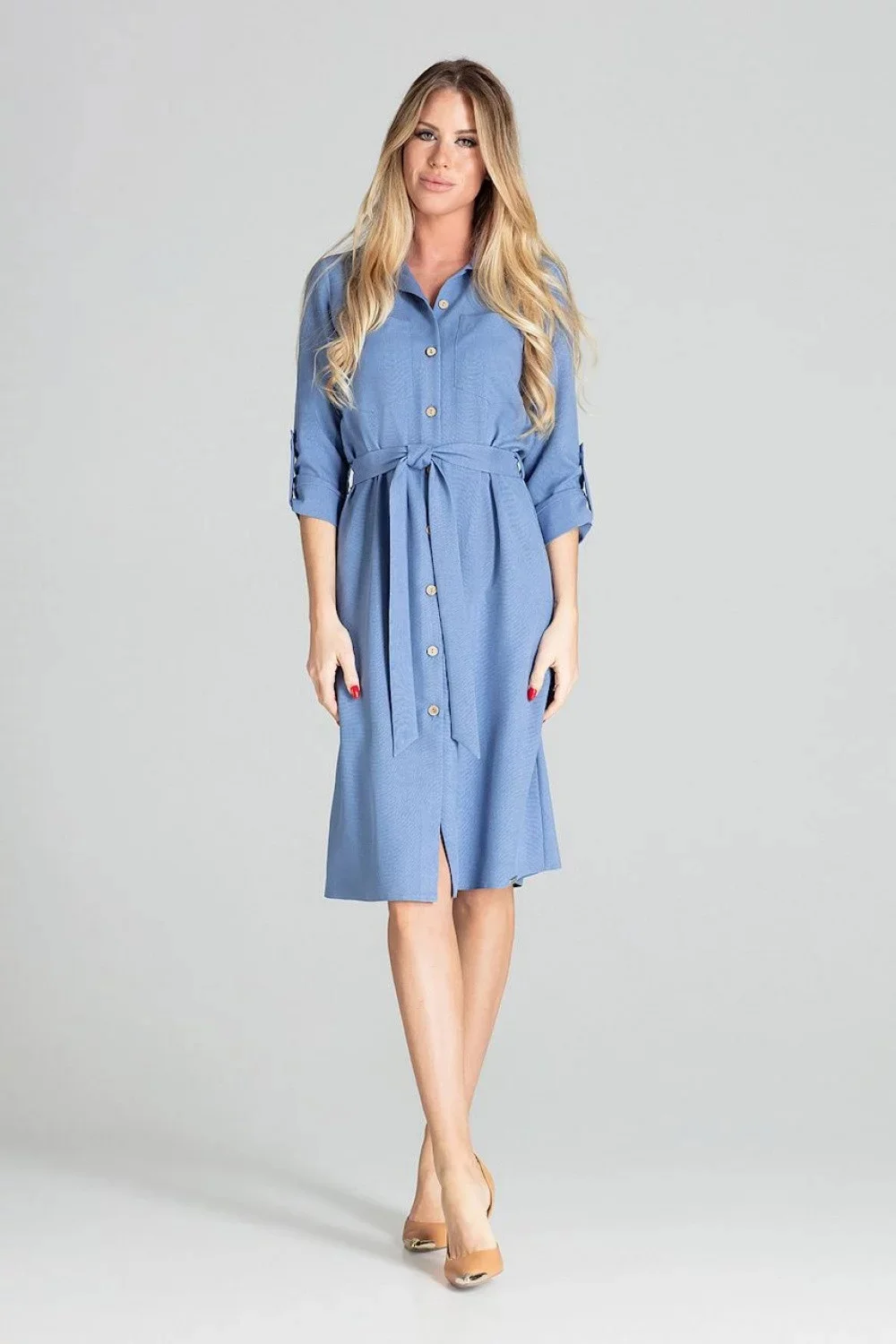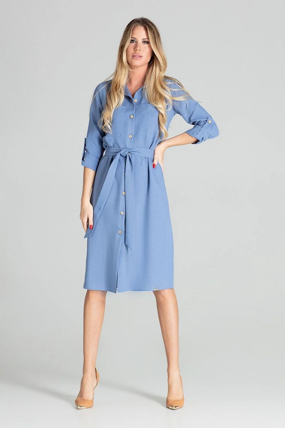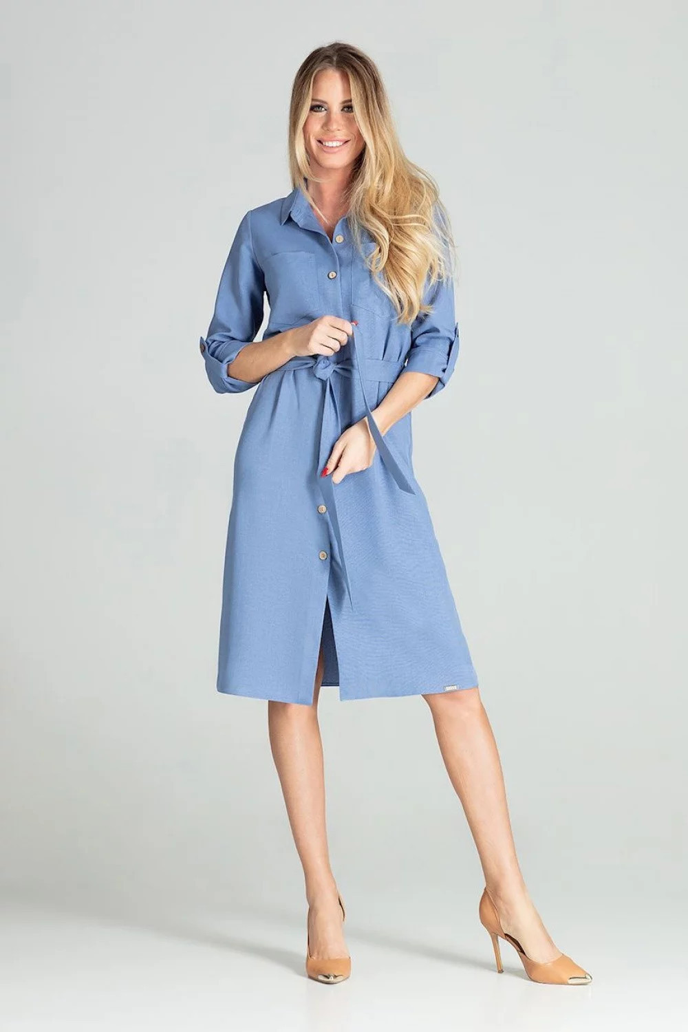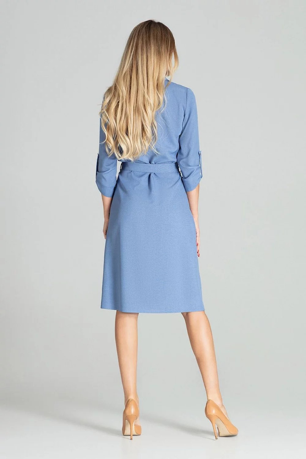Produkt Dámské šaty model 15459561 - Figl prodáváme v těchto velikostech: L-40a barvách jeans-modrá5902194380140