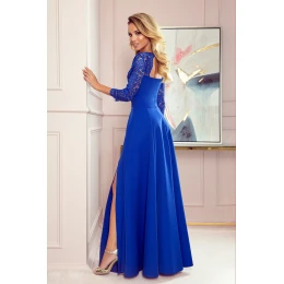 Dámské dlouhé šaty 309-2 Amber Numoco - elegantní střih - tříčtvrteční rukávy - krajkové šaty s výstřihem - s rozparkem